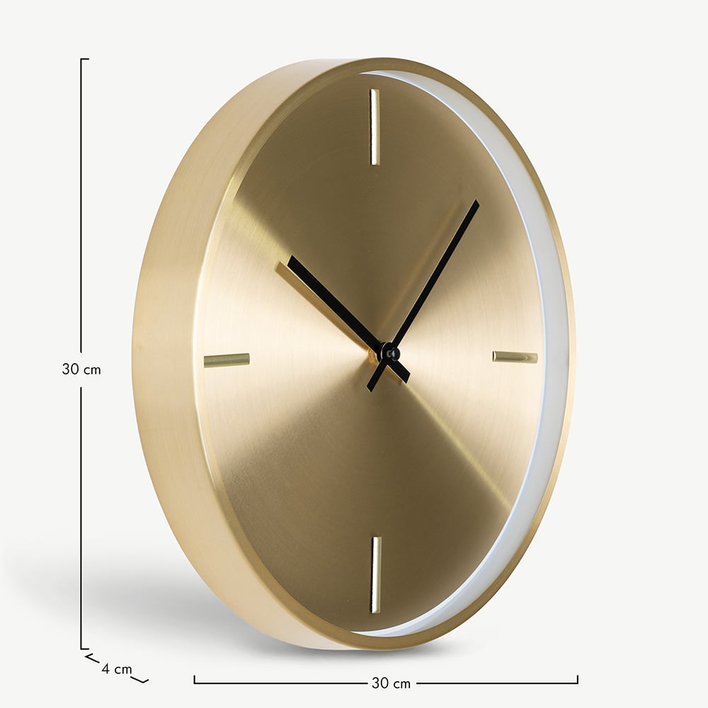 Boasting a prominent diameter of Ø30, the Demir Wall Clock demands attention. Its sleek, minimalist design, enhanced by the gleaming gold hue, seamlessly blends into modern interiors, providing both function and an air of elegance. With Demir, rooms are graced with both clarity of time and a hint of ageless charm.
