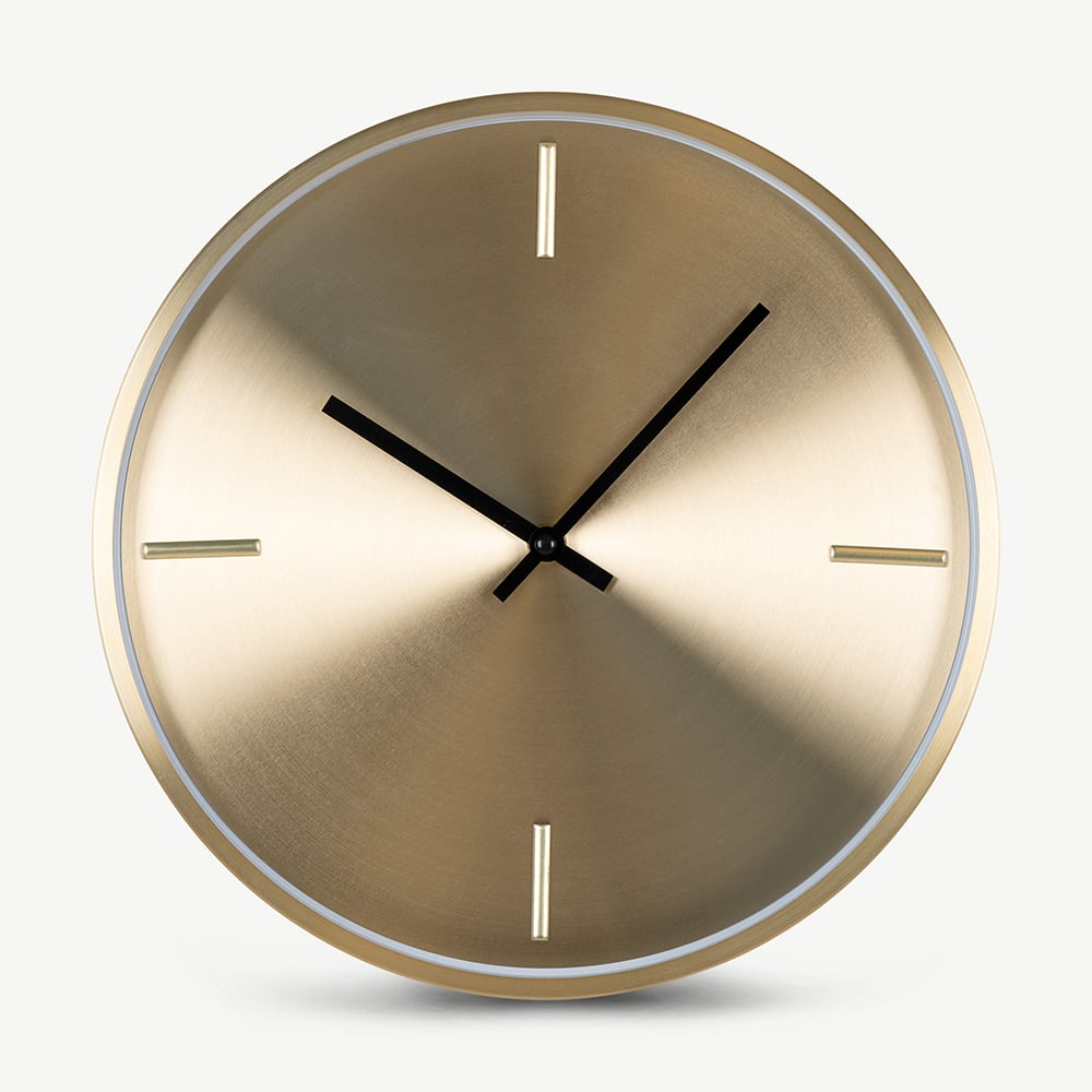 Golden Moments: Dive into the opulence of the Demir Wall Clock. This stunning wall clock combines sleek design with a striking diameter, making it a perfect statement piece for any modern interior.