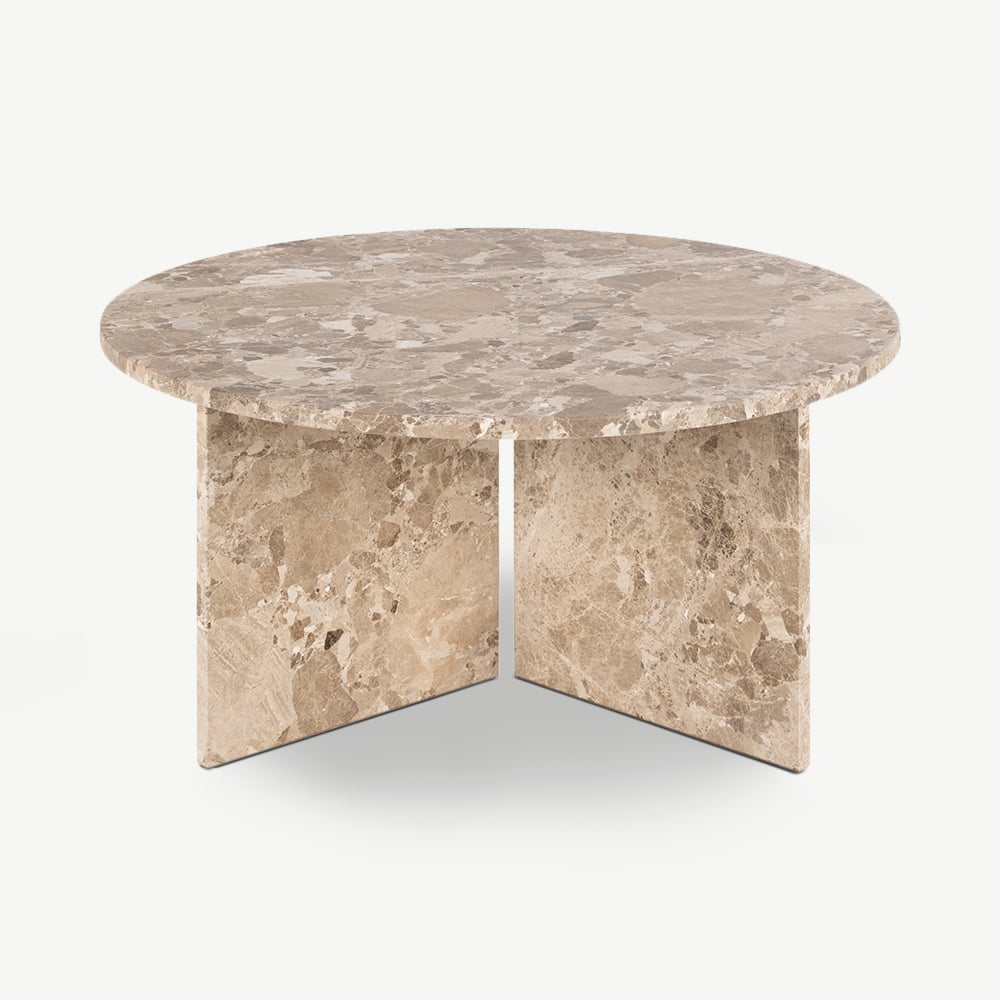 The Efrain Round Coffee Table blends sculptural design with natural elegance, crafted entirely from luxurious beige marble. Its smooth circular top is supported by a striking V-shape base, creating an architectural silhouette that feels modern and grounded. Each piece is unique, showcasing the natural beauty of the marble through subtle variations in colour, veining, and surface texture.