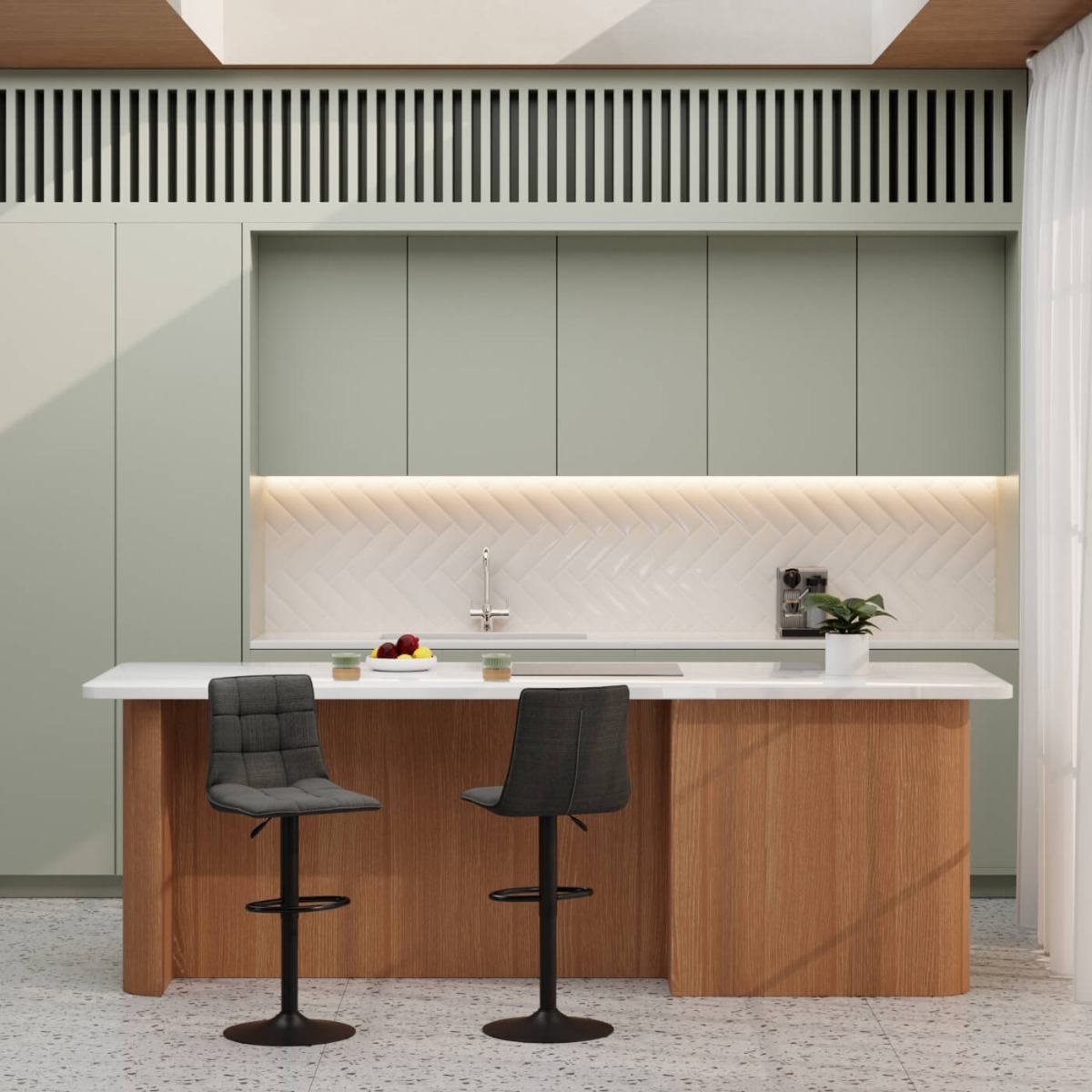 The deep grey fabric creates a bold, grounding effect, ideal for pairing with white countertops, metal finishes, or bold industrial interiors. It’s a smart addition to monochrome or urban-style kitchens seeking a sleek yet comfortable seating solution.