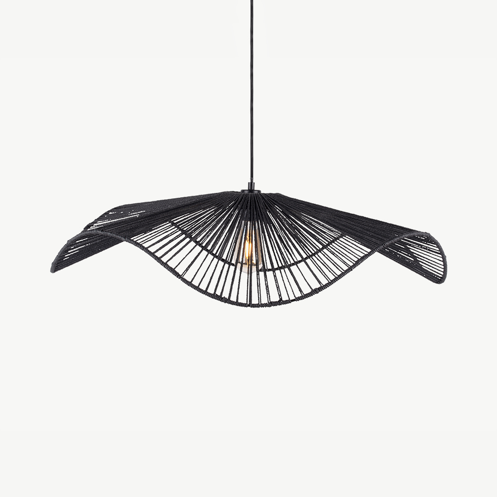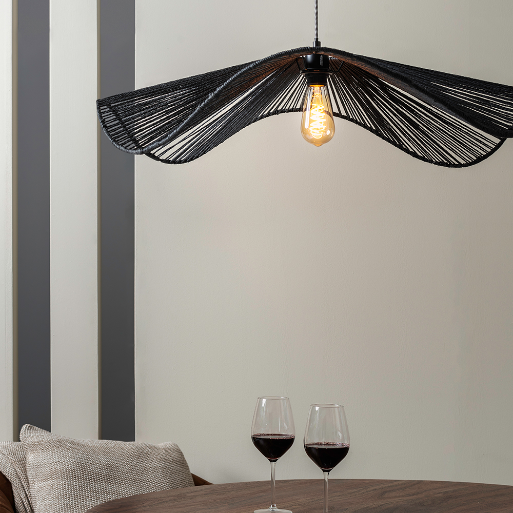The Fedora Pendant Lamp captivates with its soft, wavy effect and natural round shapes, embodying a minimalist yet stylish touch that elevates any dining area. Its elegant black finish complements a range of interior styles, from contemporary to classic, offering versatility in addition to its aesthetic appeal. This lamp is not just a source of light; it's a statement piece that enhances the ambiance of your meals and gatherings. The rope material adds a natural and environmentally friendly touch to its design.
