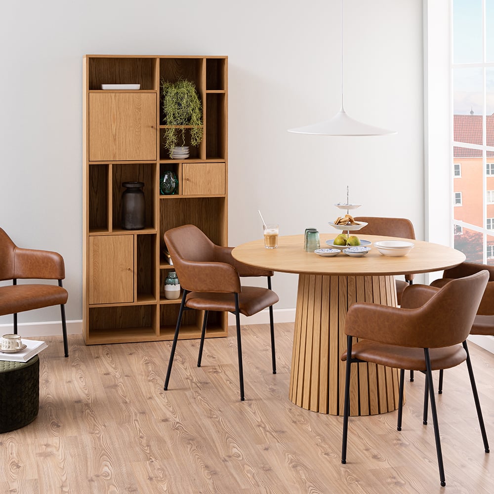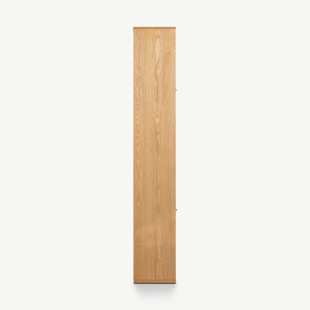 The warm, inviting tone of the oak veneer, enhanced by an oiled finish, gives the Femi Bookcase a distinct natural feel. This finish not only highlights the rich textures and patterns of the wood but also protects it, ensuring durability and a lasting appearance.