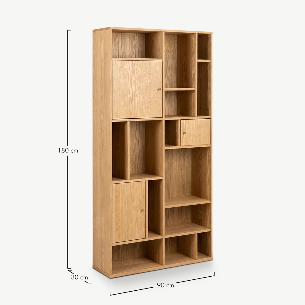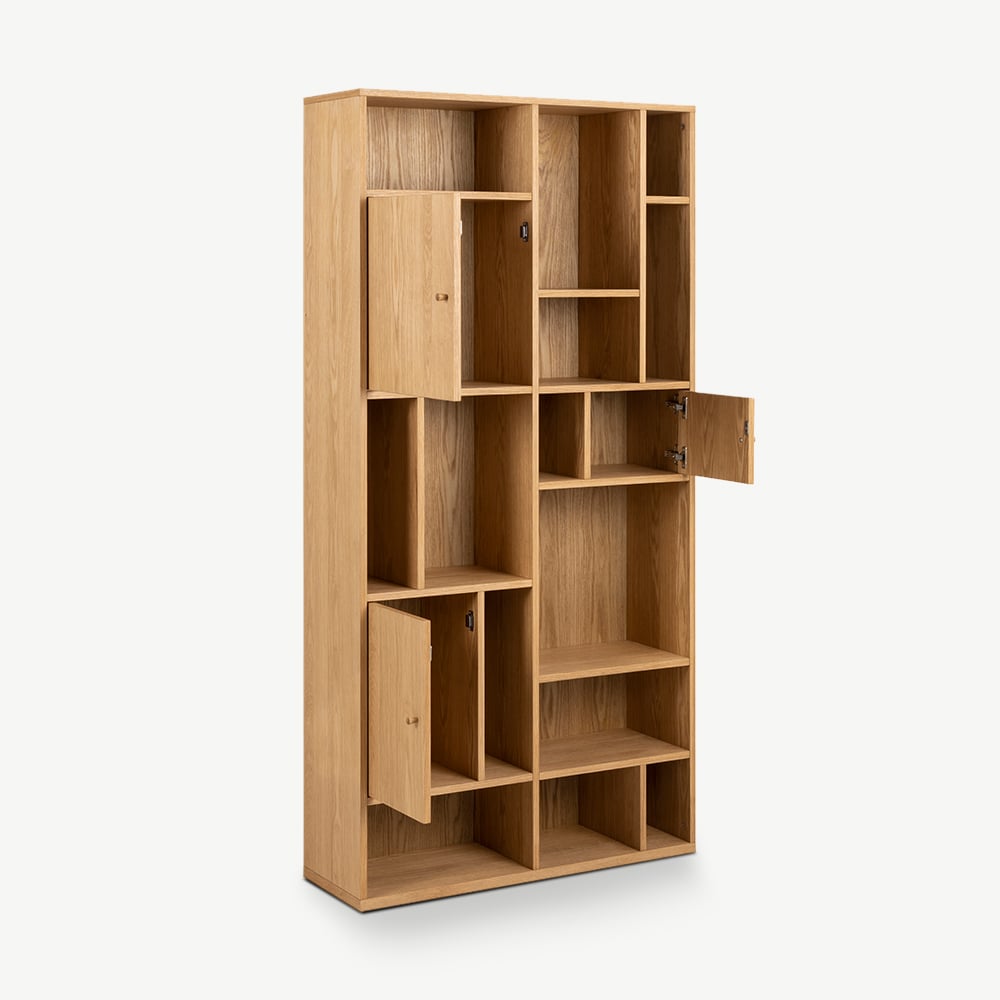 Designed with versatility in mind, the Femi Bookcase features asymmetrical detailing that adds architectural interest and modern flair. It includes 11 shelves and three doors, offering a mix of exposed and concealed storage. The open compartment allows for easy access and the display of decorative items, books, or collectibles, making it as functional as it is visually appealing.