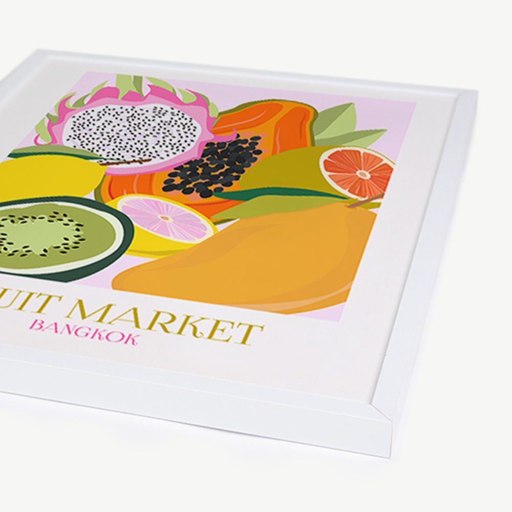 The Fruit Market Bangkok Wall Art features a white beechwood frame, known for its durability and natural beauty. The wooden frame enhances the artwork by adding depth and dimension, making it a true focal point in your interior.