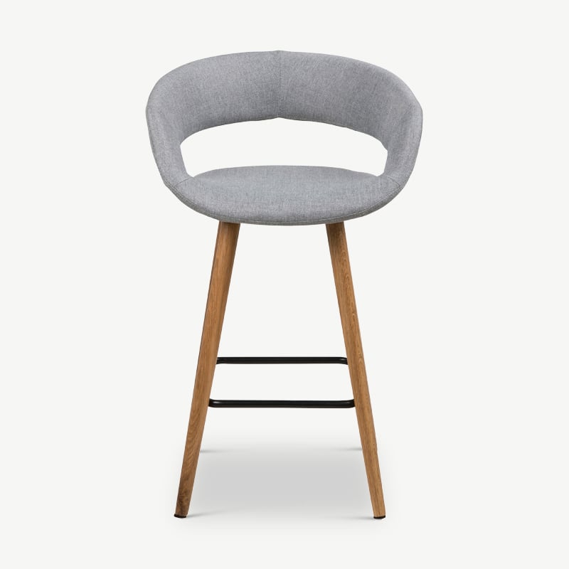 This barstool is a functional and interesting sitting option for a contemporary dining room. It has a shell seat with upholstery that is attached to a strong oak foundation for enduring durability and a natural feel. Additionally, it has an open back and a wire accent that complete the stool's appearance.