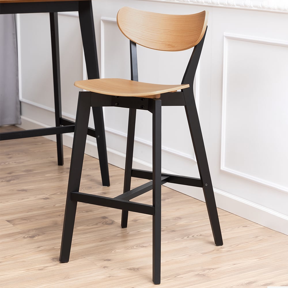 Designed with a supportive curved backrest and a wide seat, the India Bar Stool ensures comfort for casual dining, morning coffees or evening drinks. The sturdy black frame provides strength and stability, while the smooth oak veneer surface is easy to wipe clean — making it practical for everyday use.