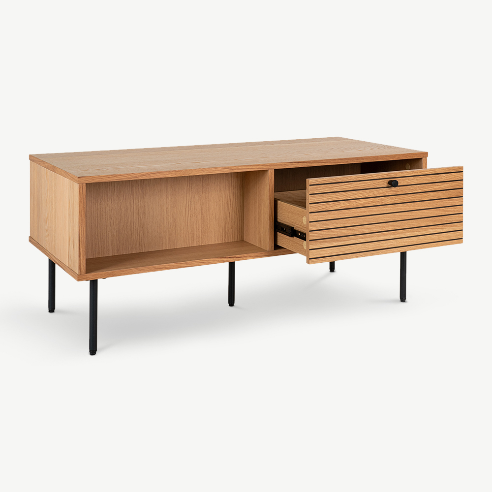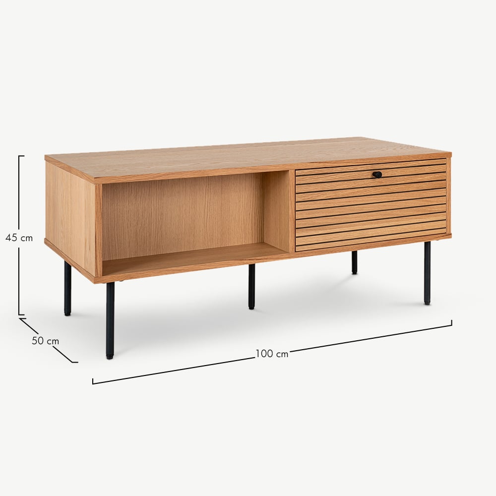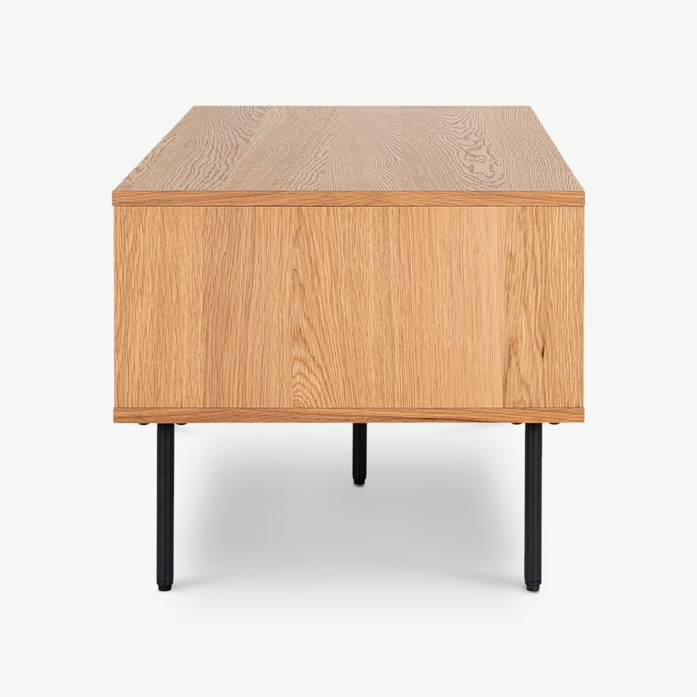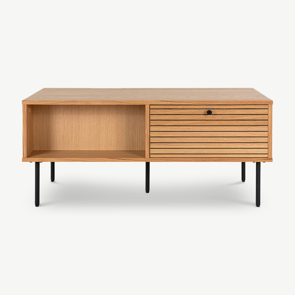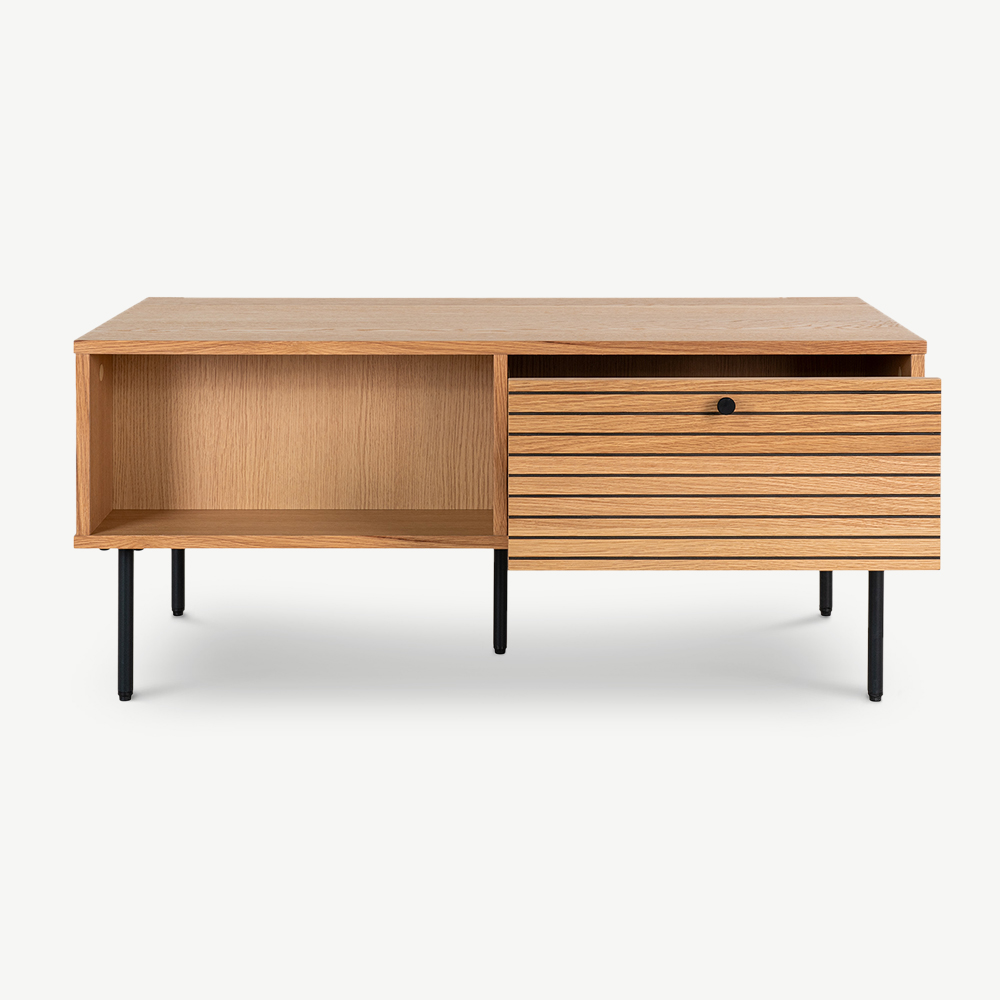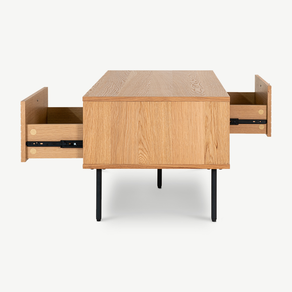 The Nara Wooden Coffee Table brings together modern design and practical functionality. Made with natural oak veneer, this table highlights the beauty of the natural wood grain, featuring two drawers and two open storage spaces, for a two-sided design for added convenience. Its sleek metal legs complement its minimalist appeal, making it a versatile choice for contemporary homes.