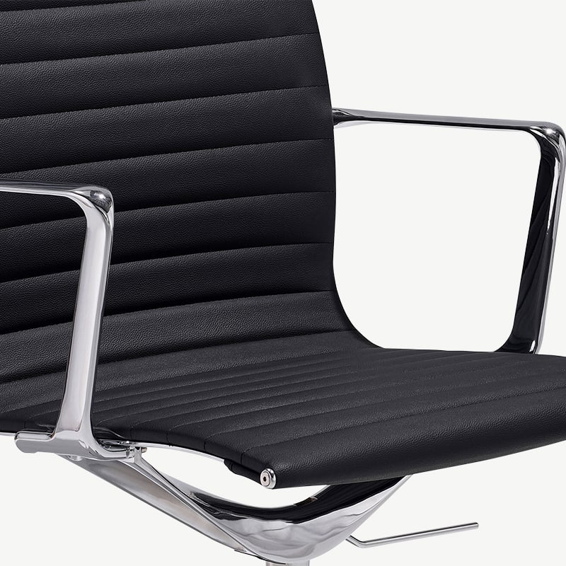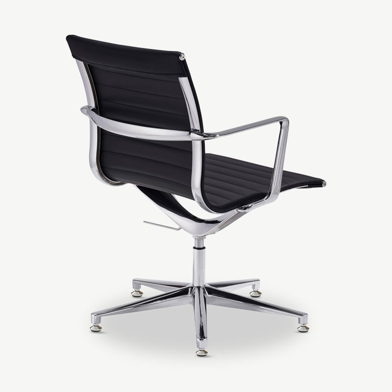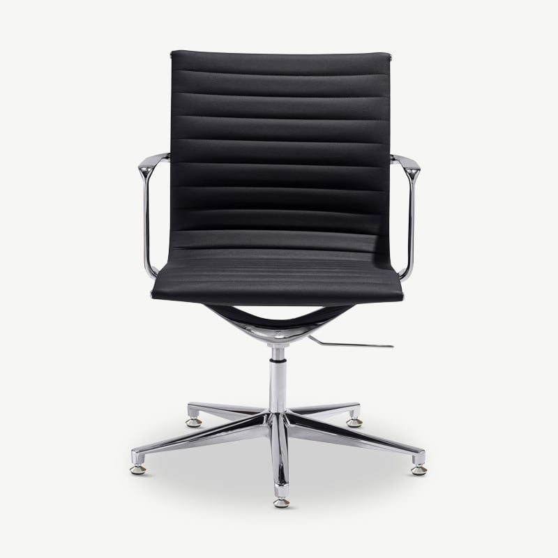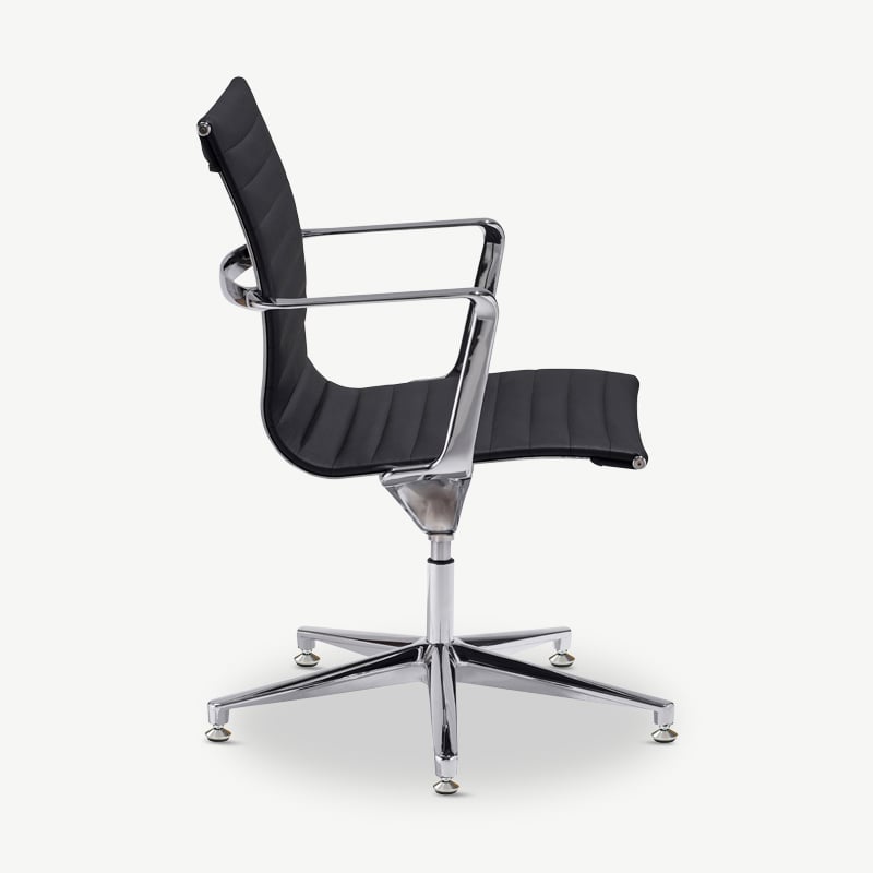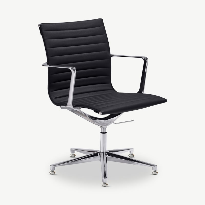 The Mateo Ribbed Conference Chair features pu-leather upholstery, chrome legs for a touch of elegance, and a ribbed design for a mid-century vibe. This chair enhances both style and functionality.