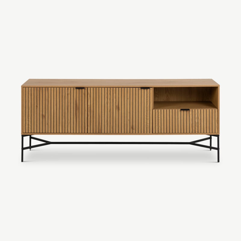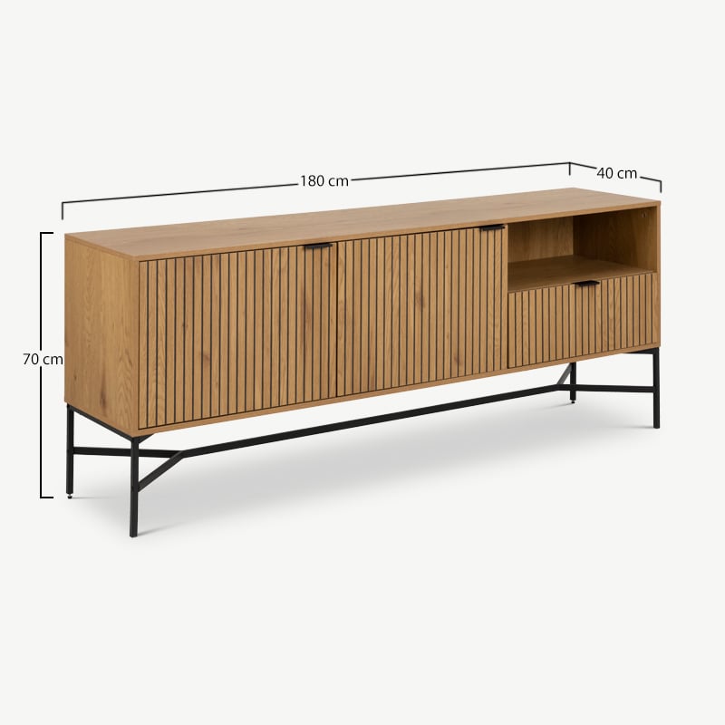 This sideboard boasts 2 doors, a drawer, and 3 shelves in a beautiful matt wild oak rough melamine finish. The unique finish adds a touch of rustic charm to any room, while the ample storage space ensures that you have plenty of room to store all of your belongings. Supported by a sturdy base in a matt black rough powder-coated metal finish, adding a modern touch to the sideboard.