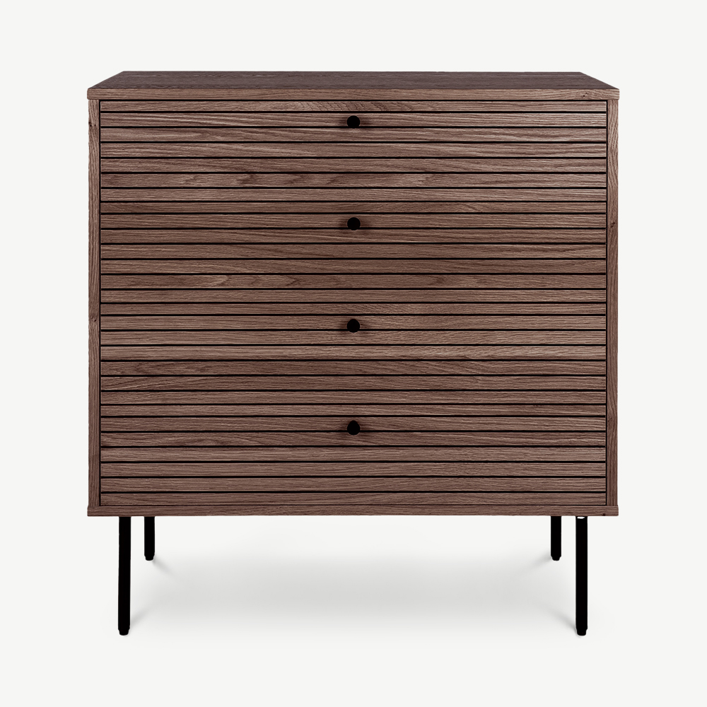 The Nara Chest of Drawers blends style and practicality, offering a sleek storage solution for any room. Crafted with brown oak veneer, this chest features a striking slatted design, four spacious drawers, and sturdy black metal legs. Its modern aesthetic and functional design make it an essential piece for a contemporary home.