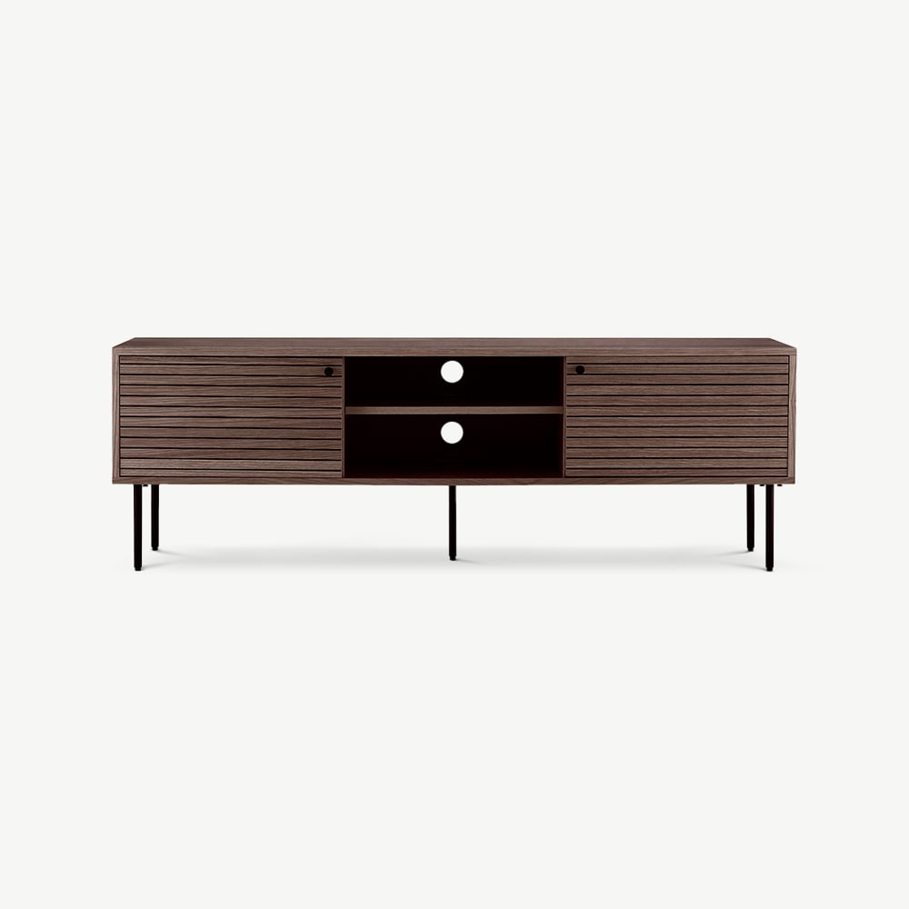 With its rich brown oak veneer finish, slatted detailing, and clean lines, the Nara TV Stand creates an inviting and sophisticated atmosphere. The combination of warm wood tones and sleek black metal legs brings balance and elegance to any living space. Perfect for entertainment or as a chic storage solution, it enhances your home with its timeless charm.