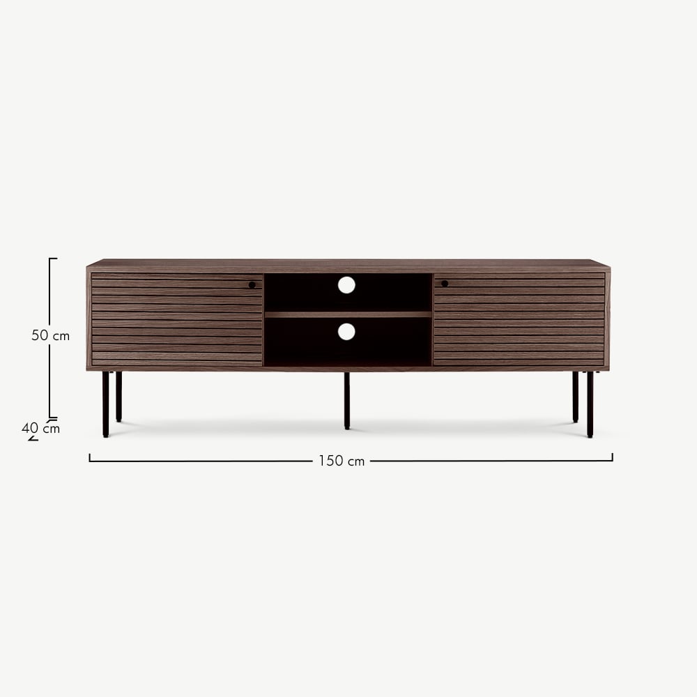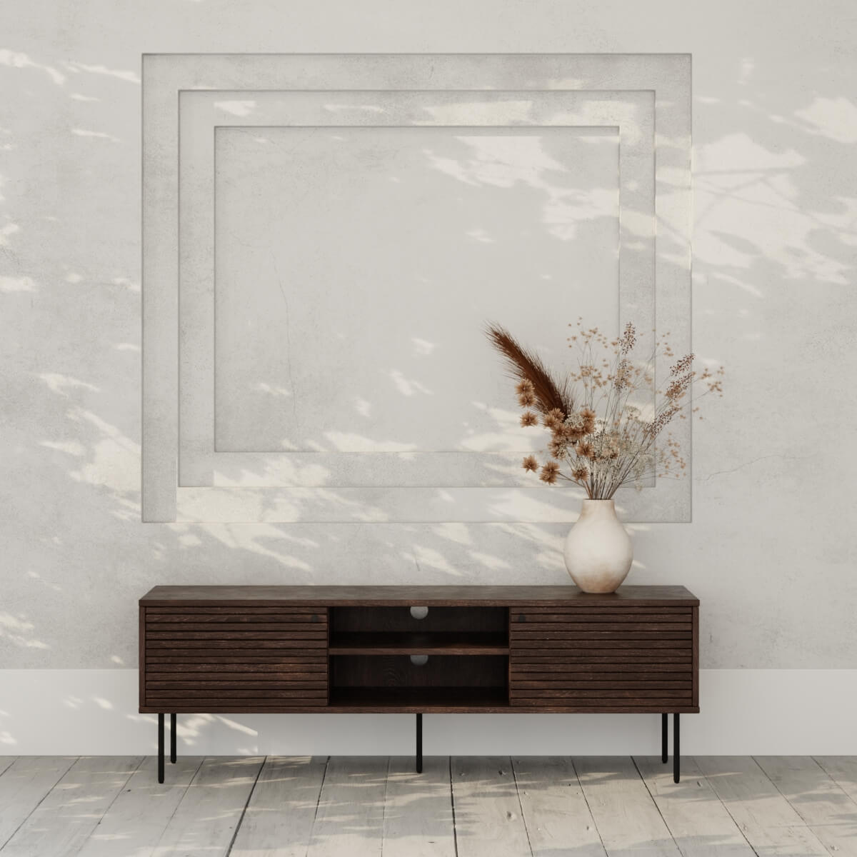Crafted with brown oak veneer, the Nara TV Stand highlights the natural beauty of wood while delivering a warm and sophisticated aesthetic. The slatted design adds texture and refinement, while the black metal legs provide modern contrast and durability. Pair it with leather sofas, neutral rugs, or metallic accents to complement mid-century, contemporary, or industrial decor styles.