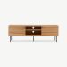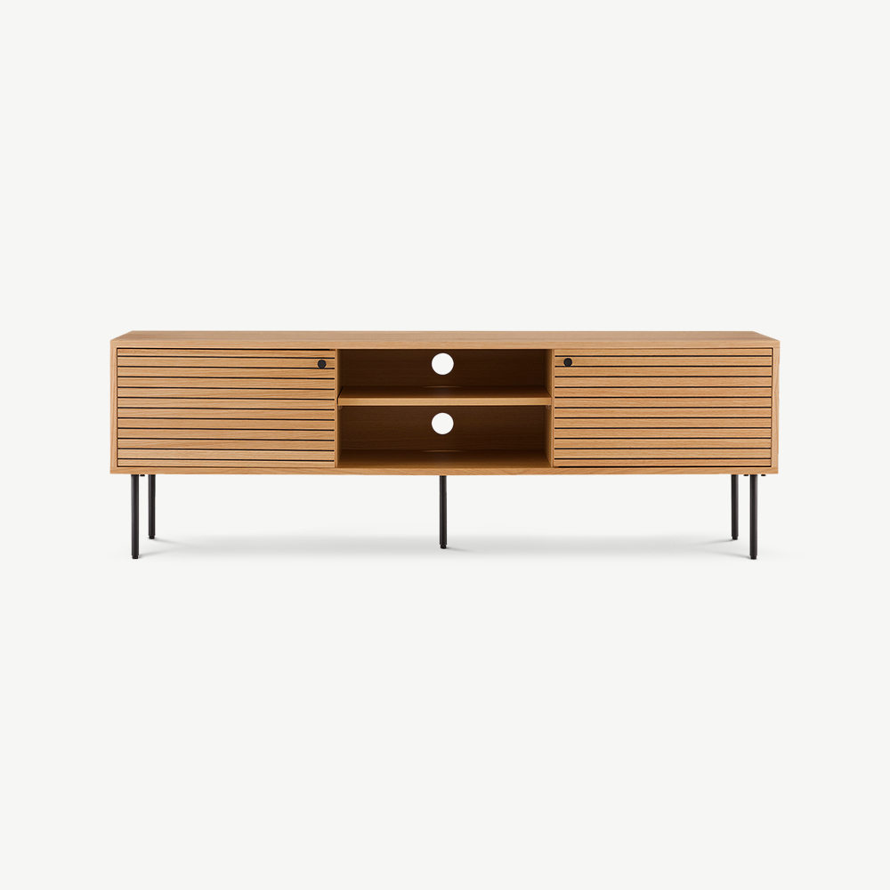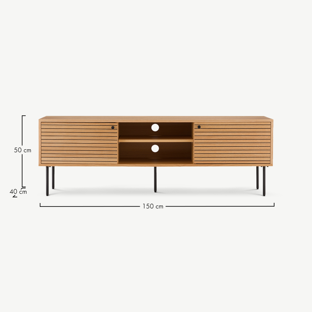 Crafted from oak veneer in a natural finish, the Nara TV Stand highlights the beauty of wood grain while delivering a clean and modern aesthetic. The slatted design adds texture and sophistication, while the sturdy black metal legs bring a touch of industrial charm. Pair it with neutral furniture, textured rugs, or metallic accents for a cohesive and stylish look, perfect for Scandinavian, mid-century, or contemporary interiors.