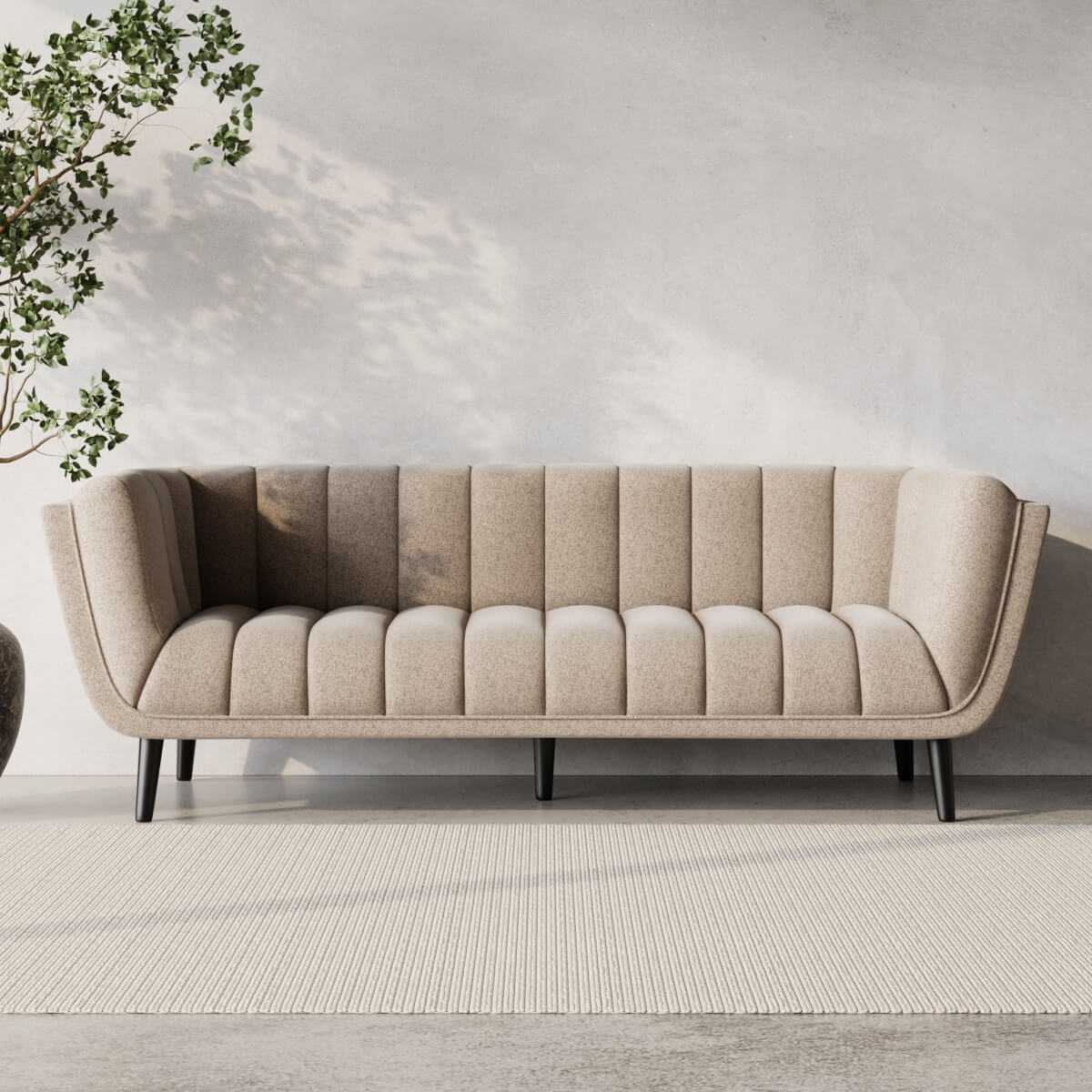 Upholstered in plush beige bouclé, the Nora Sofa offers a rich texture that enhances warmth and sophistication. The vertical channel stitching adds structure, while the curved armrests create a welcoming silhouette. The black wooden legs provide a subtle contrast, making this piece a stylish addition to mid-century, Scandinavian, and contemporary interiors. Pair it with a marble coffee table, minimalist décor, and soft lighting for a refined aesthetic.