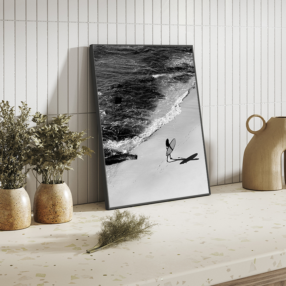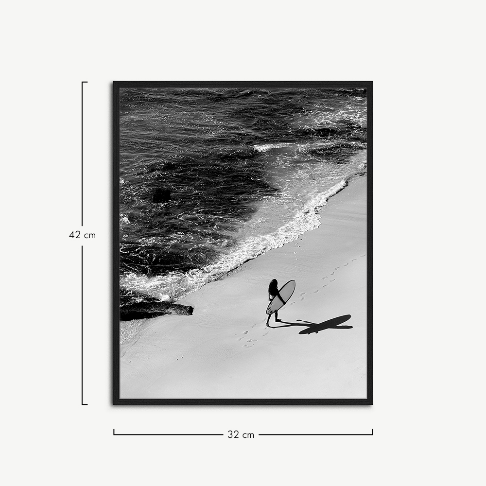 The Surf Walking Wall Art is a stunning addition to any space. This wall art for the living room comes to life in a stylish print within a black beechwood thin frame, providing a refined and contemporary look.