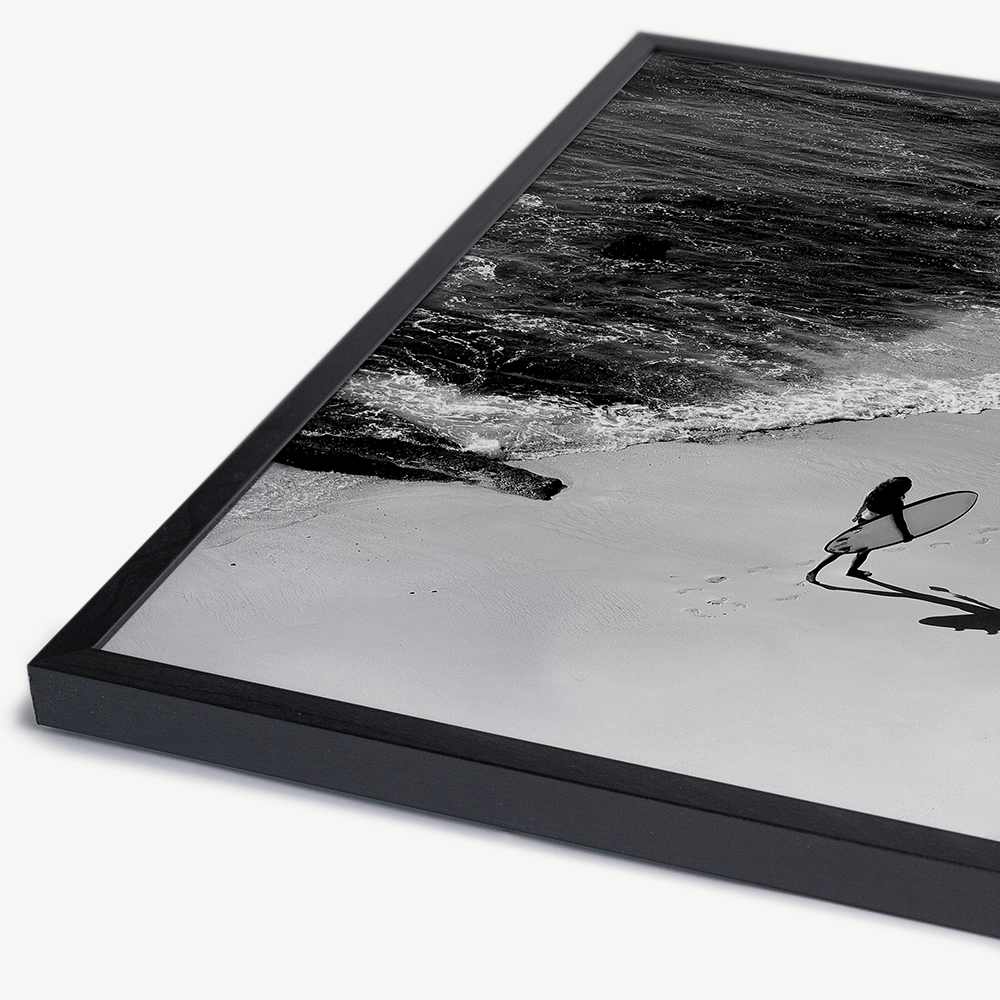 The Surf Walking Wall Art features a black beechwood frame, known for its durability and natural beauty. The wooden frame enhances the artwork, adding depth and dimension, making it a true focal point in any interior space.