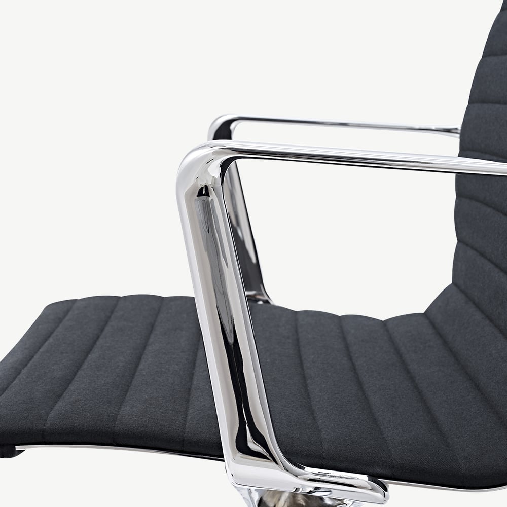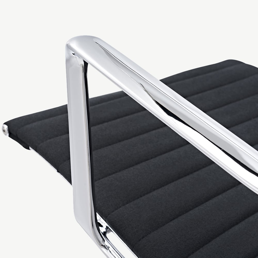 The Walton Ribbed Office Chair features premium fabric upholstery, chrome legs for a touch of elegance, and a ribbed design for a mid-century vibe. This chair enhances both style and functionality.