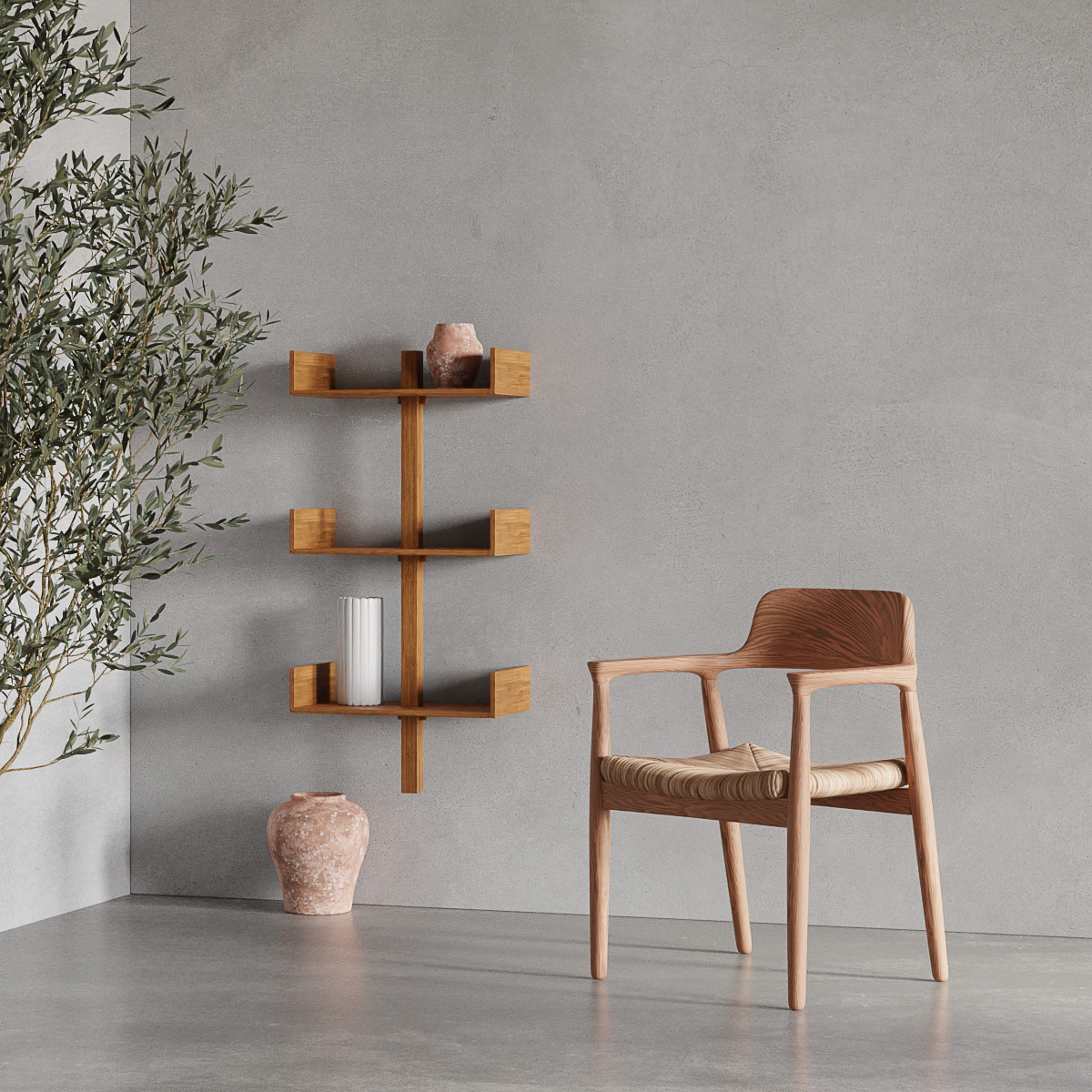 Step into the harmonious world of the Zephyr triple shelf, where sophistication meets utility.