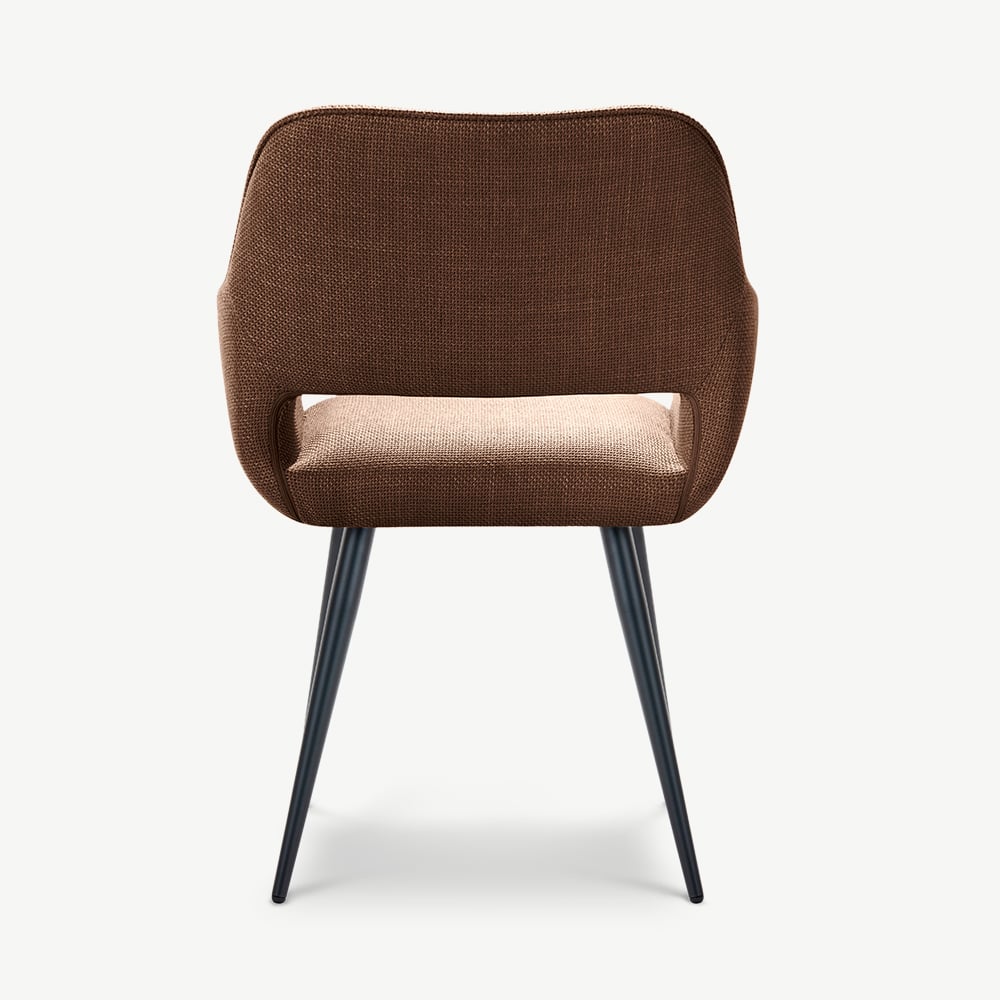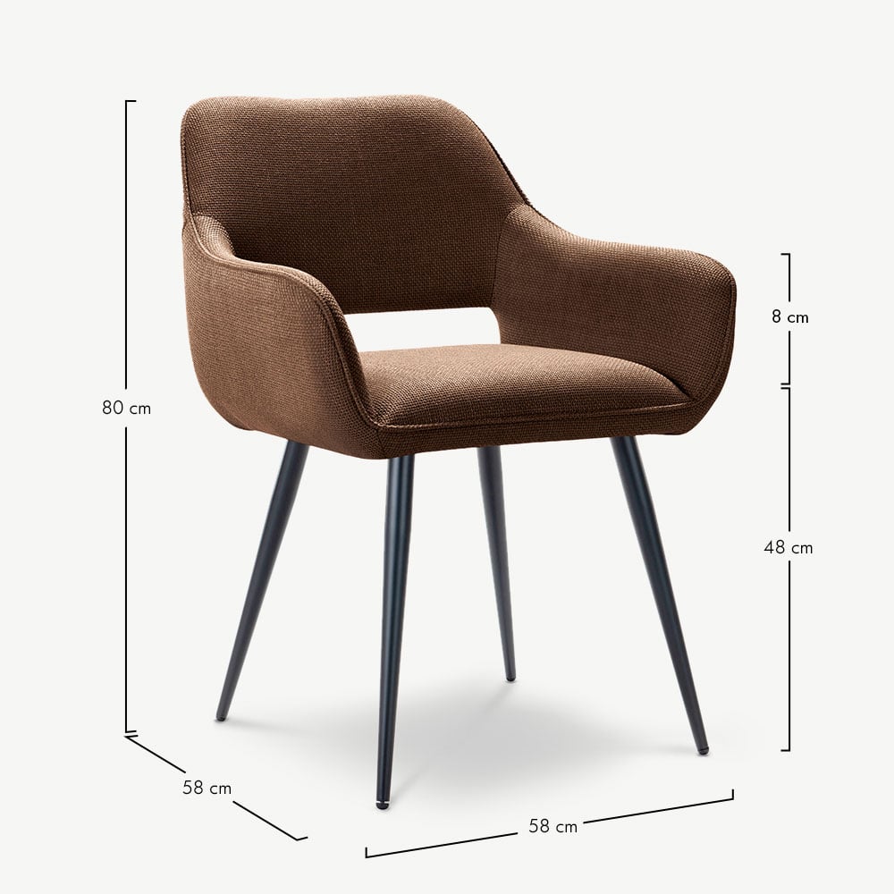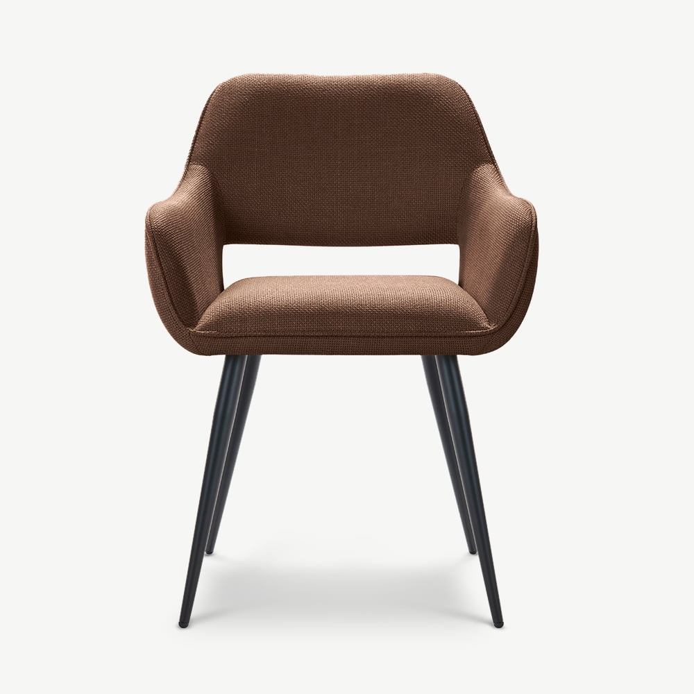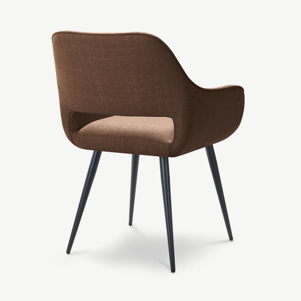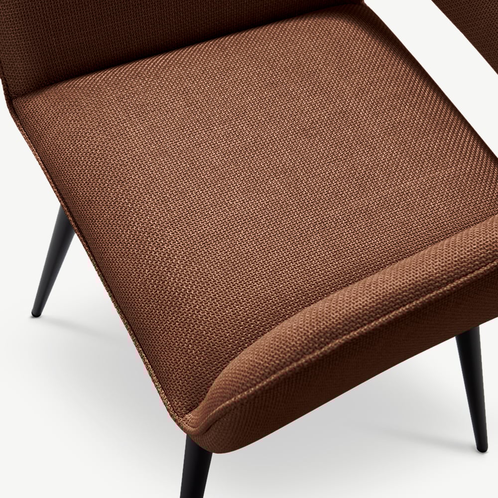 The Adele Dining Armchair adds warmth and character to your space with its terracotta fabric upholstery and black coated metal legs. It offers a cosy yet contemporary look ideal for modern living.