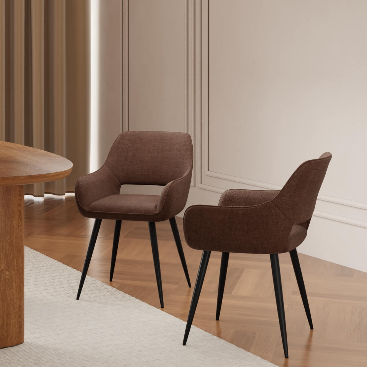 Upholstered in inviting terracotta fabric, this chair pairs beautifully with warm woods, neutrals or monochrome palettes. The robust upholstery not only adds colour but also provides a soft, tactile feel that's built to last.