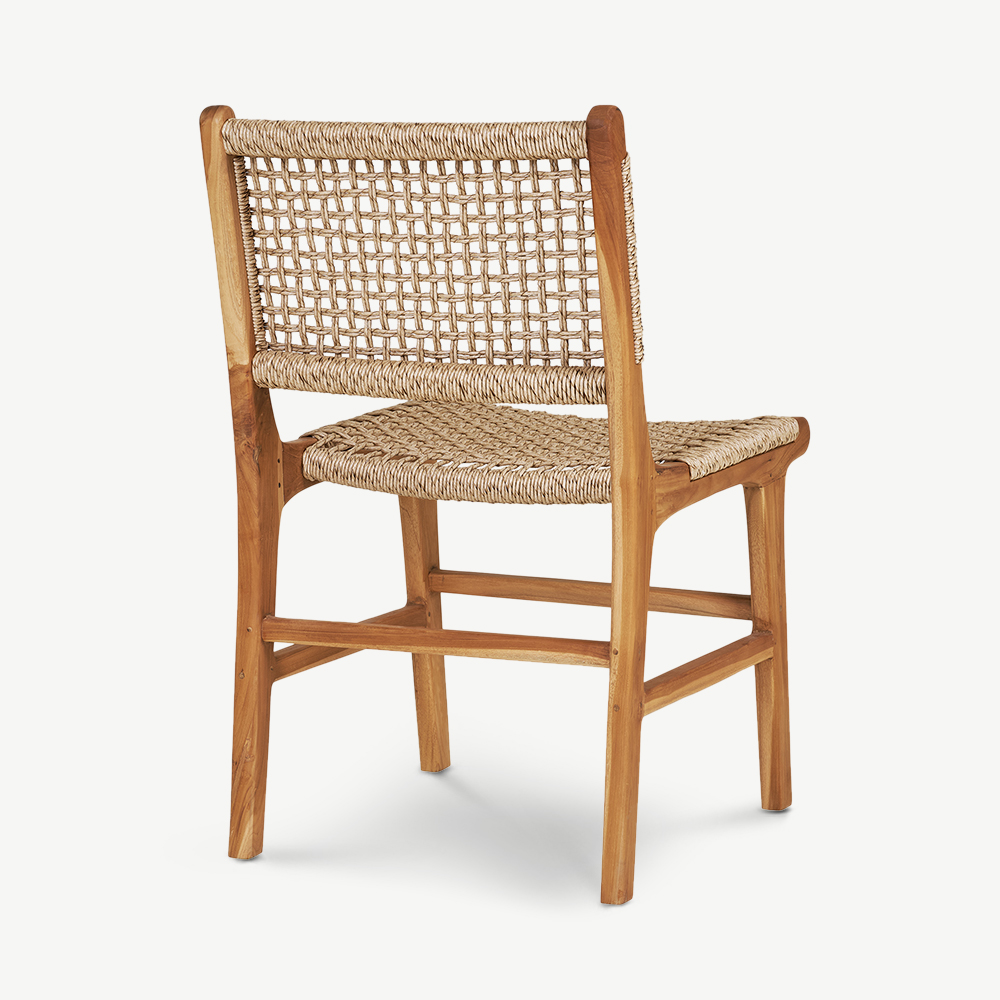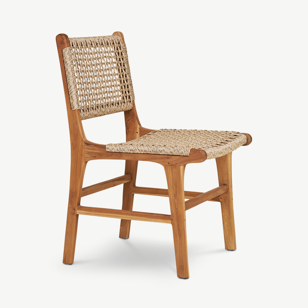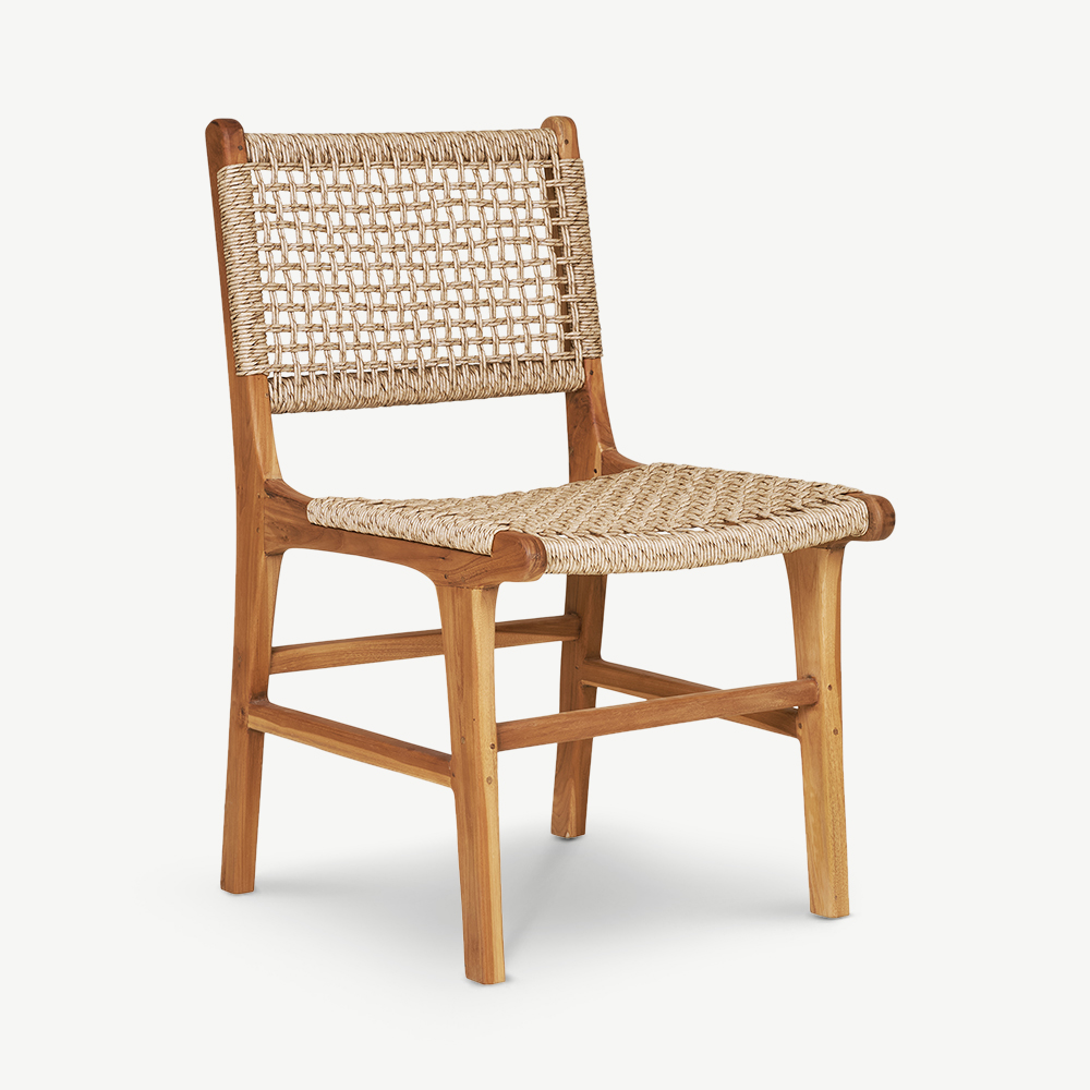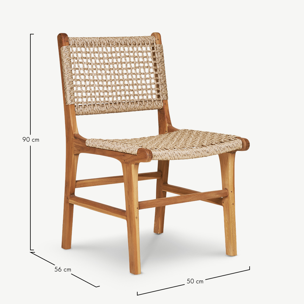 Fabriquée en teck massif et rotin synthétique, cette chaise dégage chaleur et durabilité. Les teintes naturelles du bois se marient à merveille avec des intérieurs côtiers, bohèmes ou scandinaves, tandis que le tressage en rotin ajoute texture et charme artisanal. Associez-la à des tables en teck ou à un décor neutre pour un look harmonieux et accueillant.