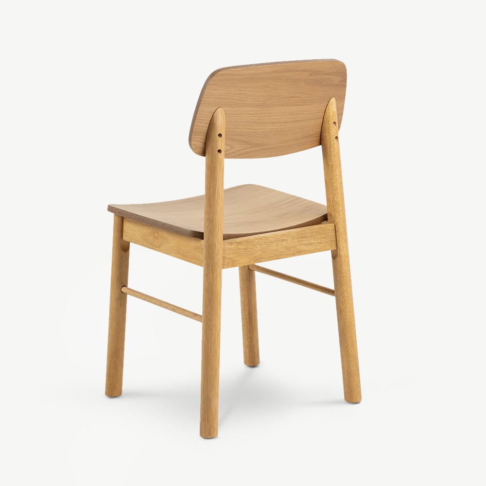 L’assise en placage chêne laqué met en valeur les veines du bois tout en assurant une surface lisse et facile à nettoyer. Le cadre solide et les pieds arrondis en bois teinté chêne renforcent le ton naturel et la robustesse de l’ensemble. Ces chaises s’associent parfaitement à des tables en chêne ou en finition bois, et s’intègrent avec élégance dans des intérieurs scandinaves, Japandi ou rustiques contemporains.