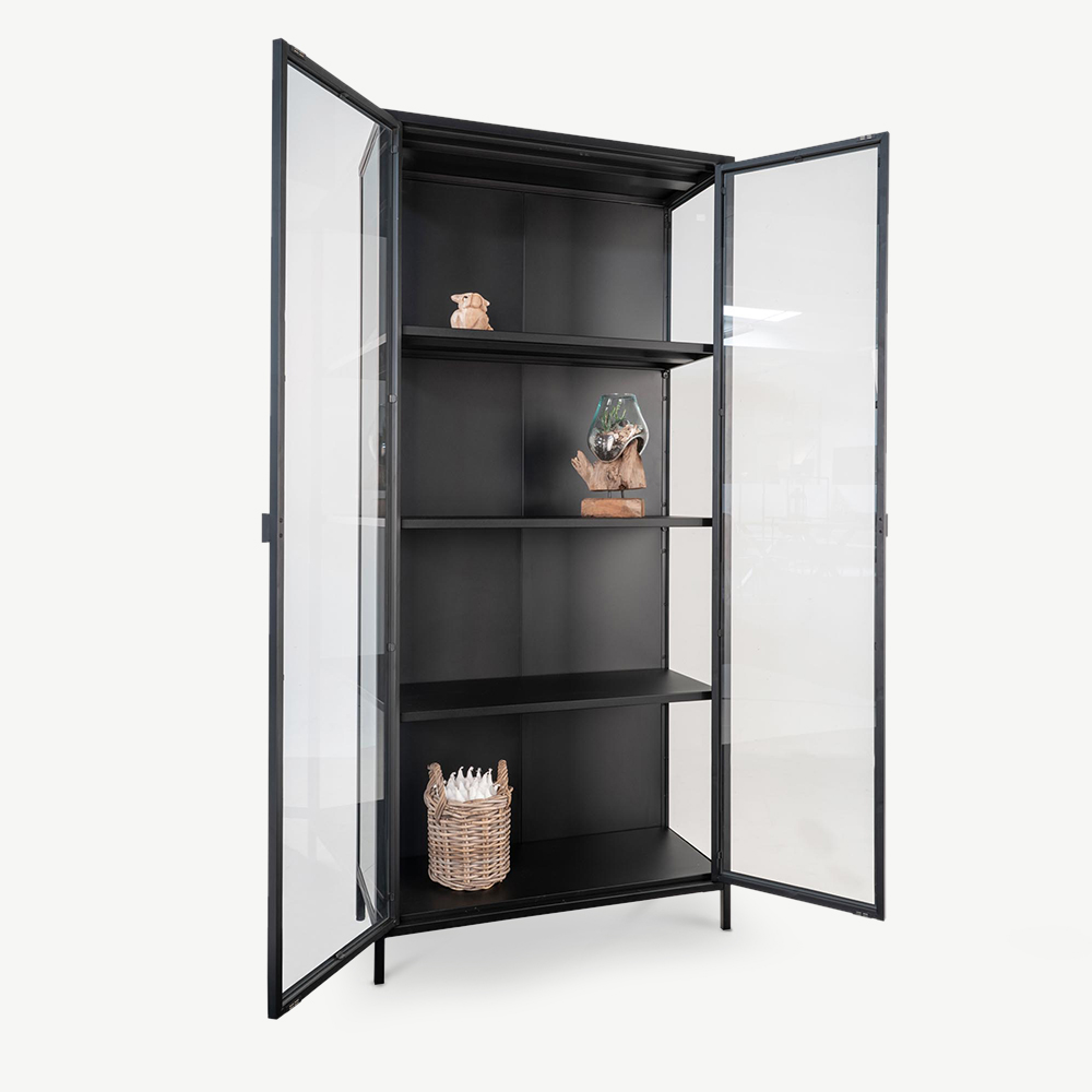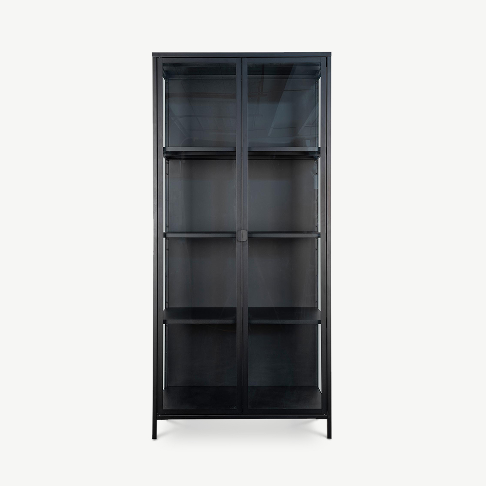 - Structure en métal noir avec des portes en verre robustes.