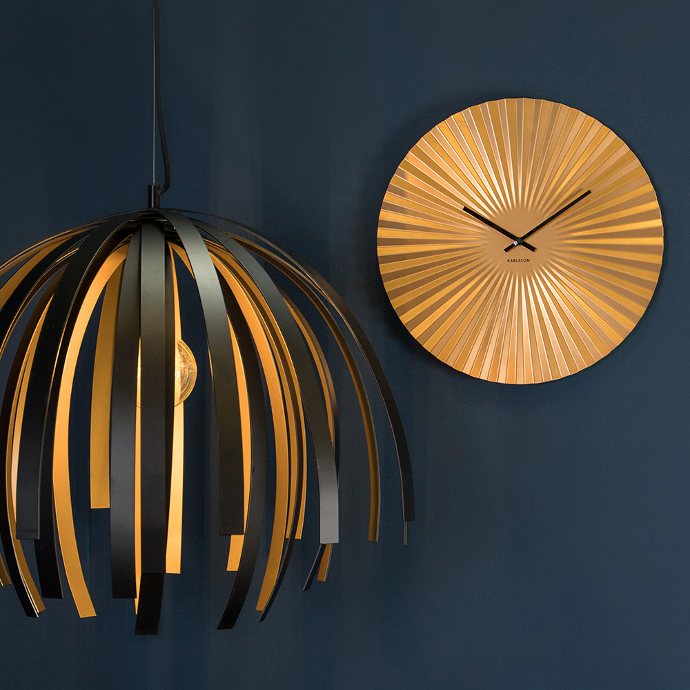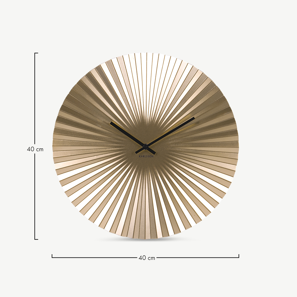 Nous vous présentons l'horloge murale Moon en acier doré, pièce fonctionnelle et élégante de la collection Furnicher. Cette horloge murale, dont la forme évoque celle d'un éventail japonais, possède une esthétique unique qui s'intègre particulièrement bien dans les intérieurs modernes.