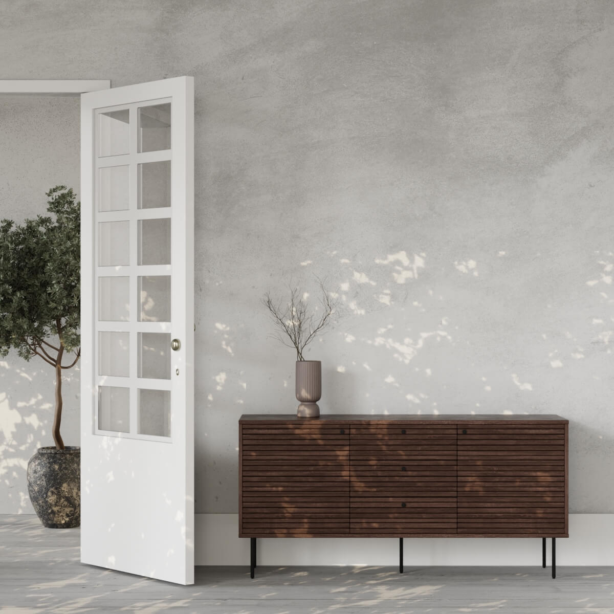 Fabriqué en placage de chêne brun, le buffet Nara met en valeur la texture naturelle du bois, apportant chaleur et profondeur à votre intérieur. Le design à lamelles renforce son attrait contemporain, tandis que les pieds en métal noir offrent une base élégante et moderne. Ce buffet s’accorde parfaitement avec les intérieurs mid-century ou industriels. Associez-le à des palettes neutres, des tissus doux ou des accents métalliques pour un look harmonieux et élégant.