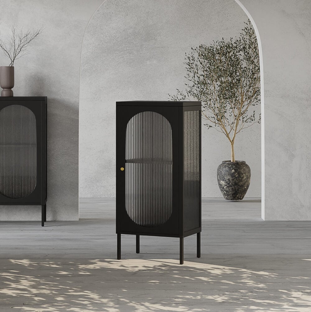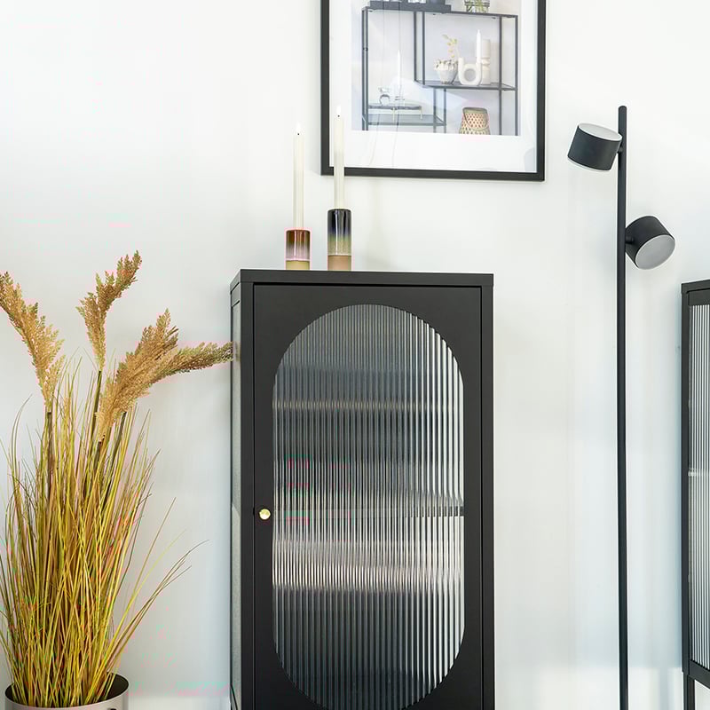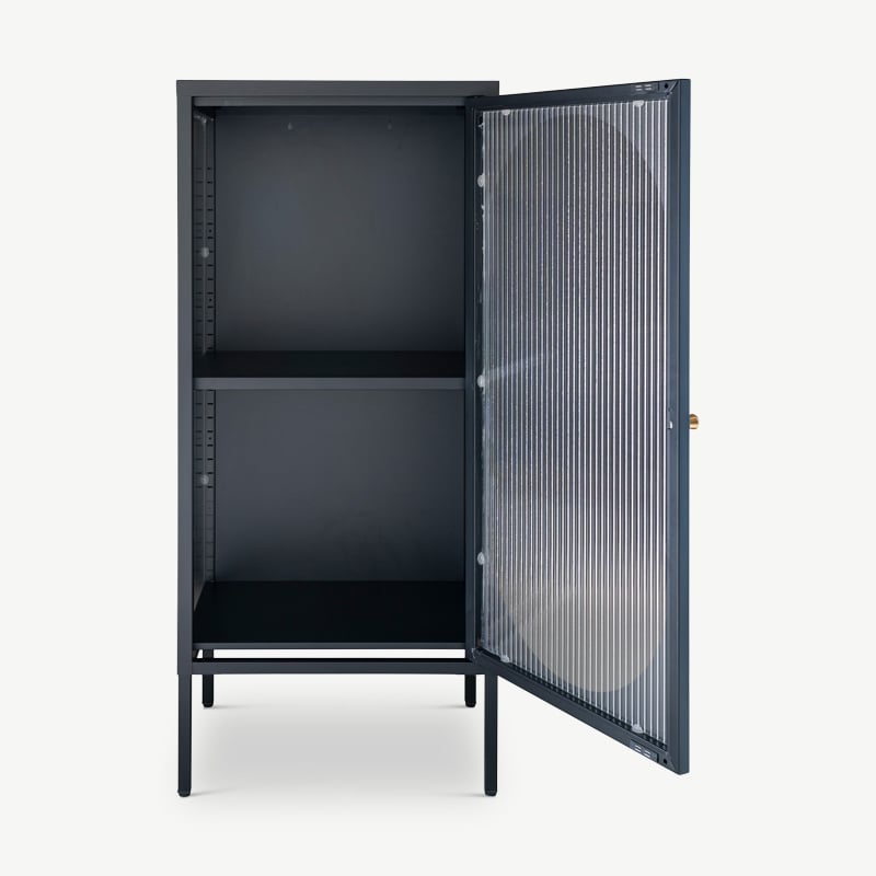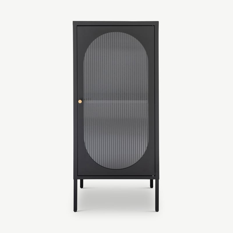 Le design de la porte en verre strié de l'armoire Hobart ajoute de la texture tout en dissimulant subtilement les objets stockés. Cette caractéristique apporte un attrait vintage et adoucit le cadre métallique de la vitrine, équilibrant robustesse et aspect léger, idéal pour exposer des objets précieux.