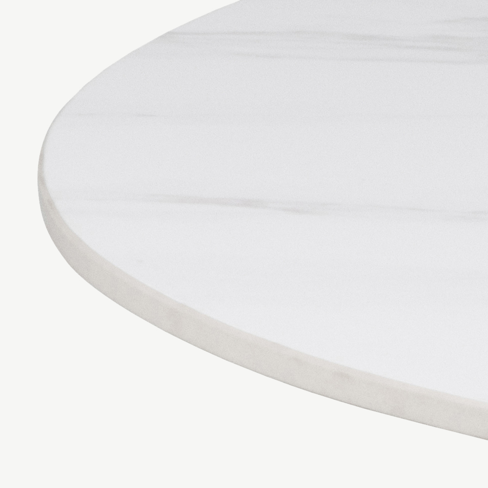 Le plateau en céramique blanche offre un rendu net et lumineux avec une finition mate qui s’harmonise parfaitement avec un décor moderne ou minimaliste. Son pied en métal blanc ajoute une touche élégante et fluide. Associez-la à des tabourets de bar en blanc, noir ou bois pour un ensemble chic et cohérent.