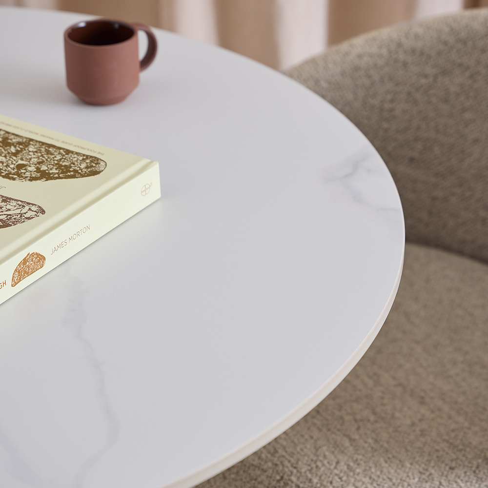 Avec un diamètre de Ø80 cm, la table Eliza est parfaite pour les petits espaces ou les pièces ouvertes. Le plateau est résistant à la chaleur et aux rayures, tout en étant facile à entretenir. Son pied central offre un bon dégagement pour les jambes et un encombrement réduit.