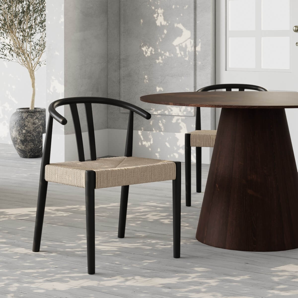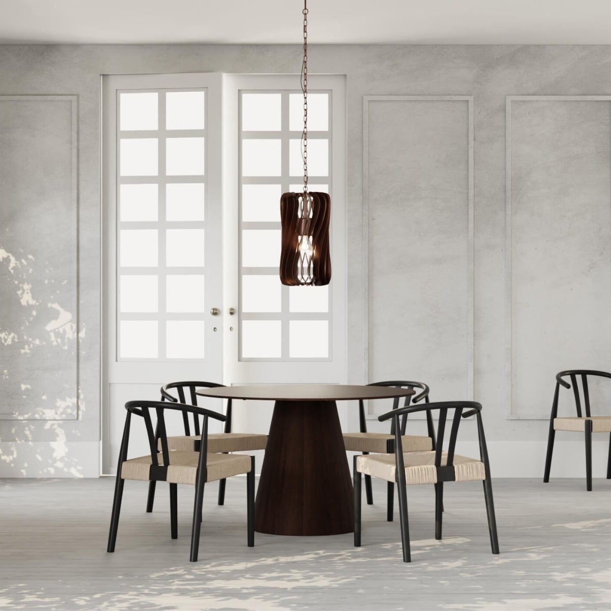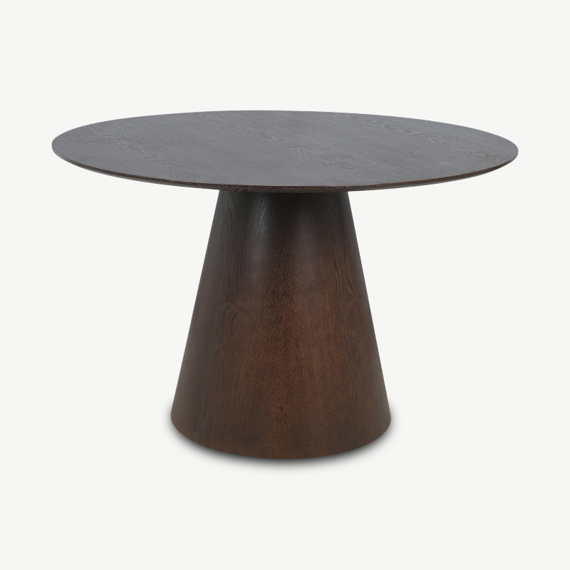 Dotée d’un plateau en placage noyer et d’un pied central conique assorti, cette table s’intègre parfaitement dans un intérieur moderne, industriel ou d’inspiration mid-century. Elle se marie à merveille avec des chaises en bois foncé, des assises en cuir ou des accents métalliques, apportant richesse et caractère à votre salle à manger.