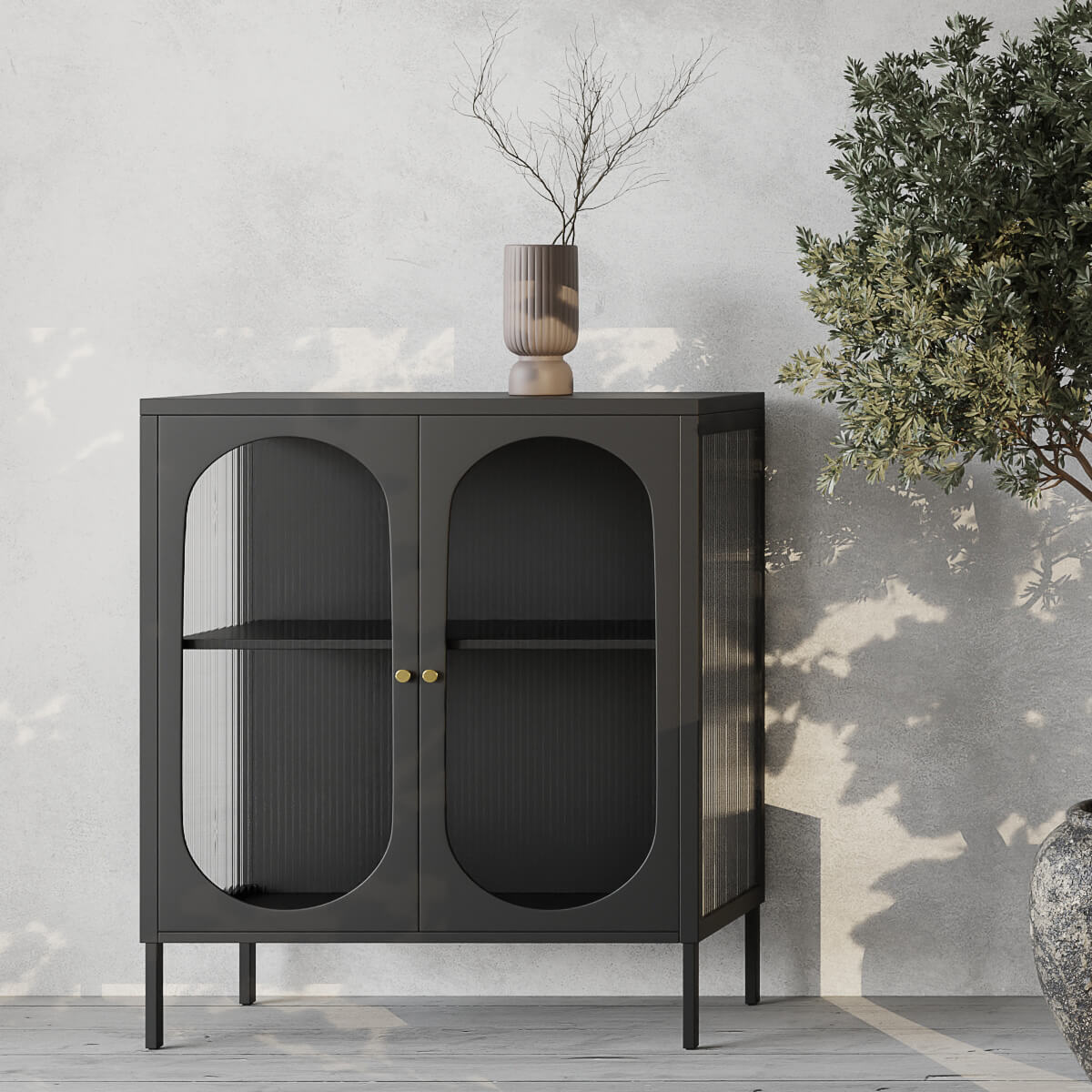 Le design de la porte en verre strié de l'armoire Hobart ajoute de la texture tout en dissimulant subtilement les objets stockés. Cette caractéristique apporte un attrait vintage et adoucit le cadre métallique de la vitrine, équilibrant robustesse et aspect léger, idéal pour exposer des objets précieux.