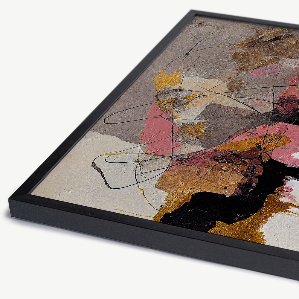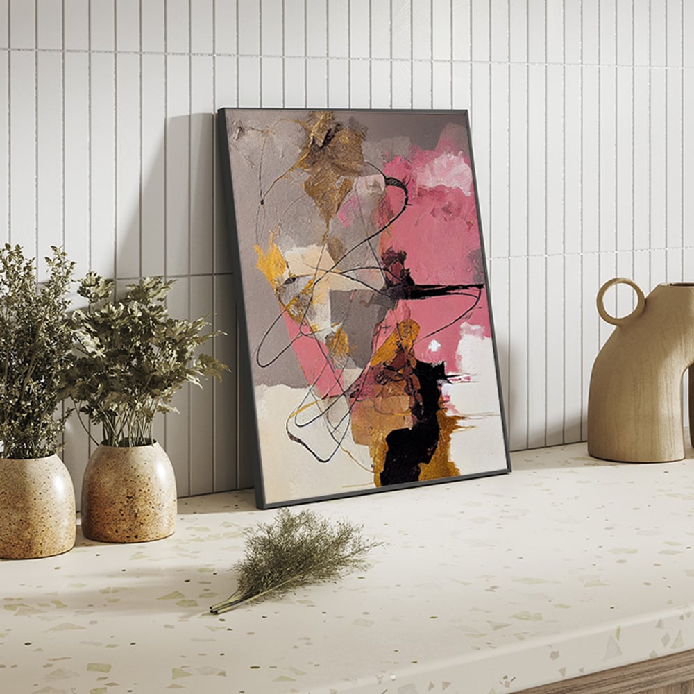 De abstracte roze poster wordt geleverd in een zwarte lijst, bekend om zijn duurzaamheid en natuurlijke schoonheid. Het houten frame omlijst de abstracte poster op een manier die diepte en dimensie toevoegt, waardoor het een echt middelpunt in je interieur wordt.