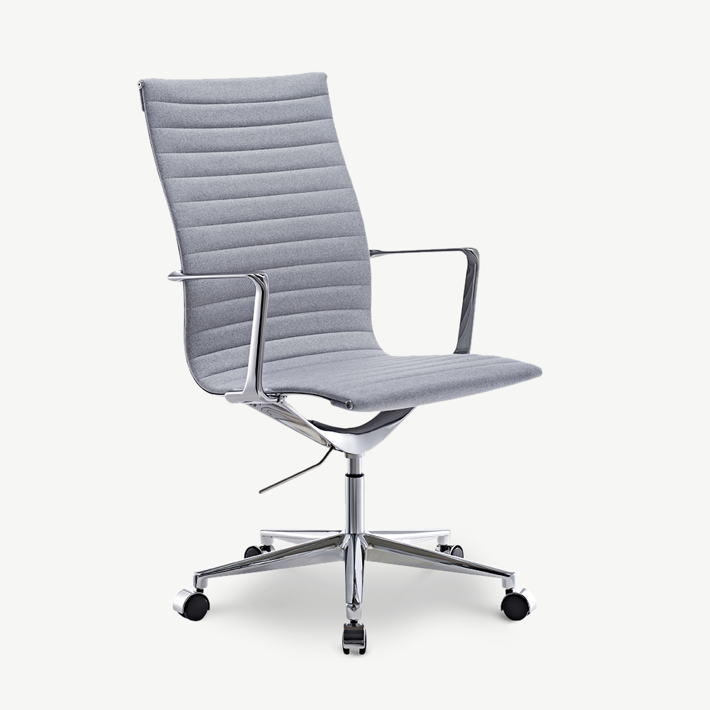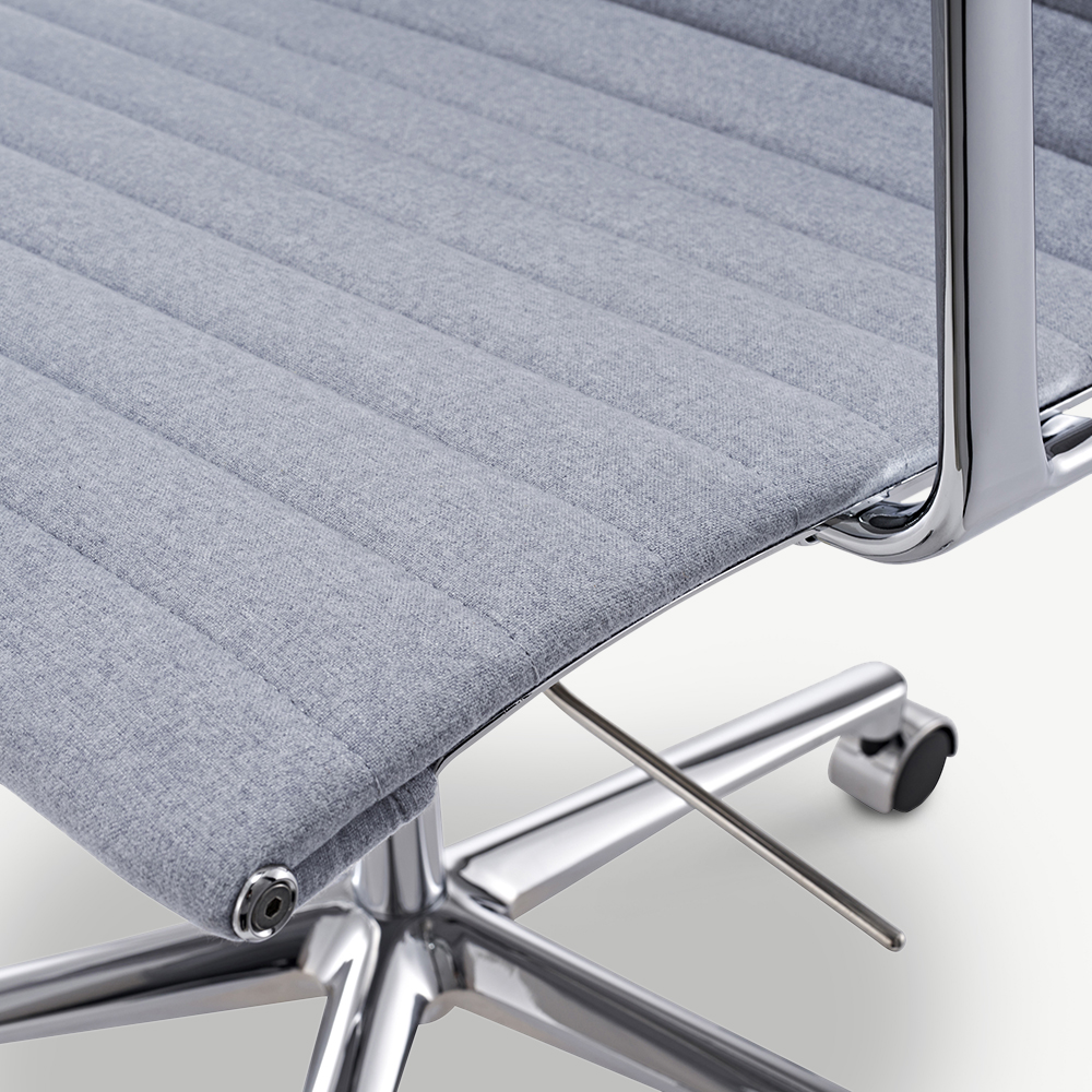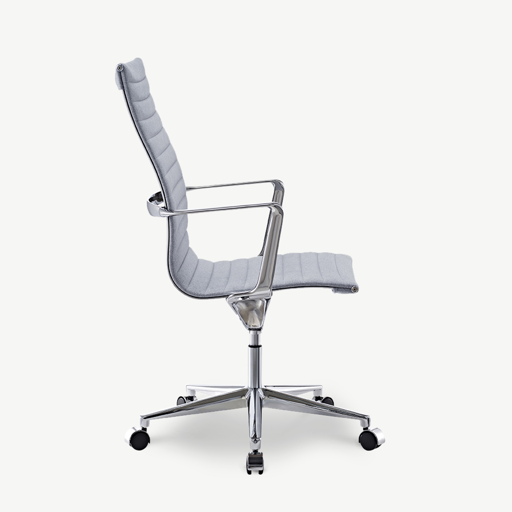 Met een stevig frame en poten van verchroomd metaal combineert de stoel stijl en stabiliteit. De mid-century designelementen en hoge rugleuning voegen een tijdloze elegantie toe aan elke werkplek.