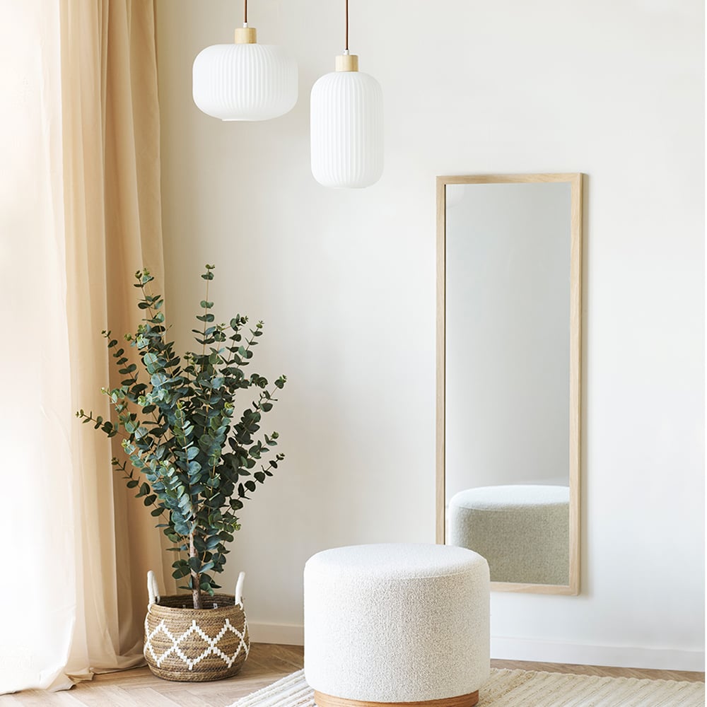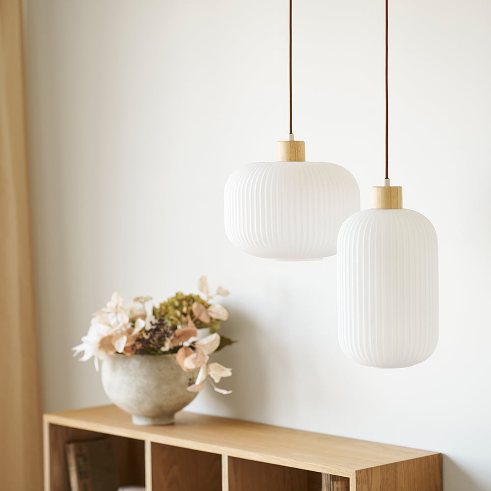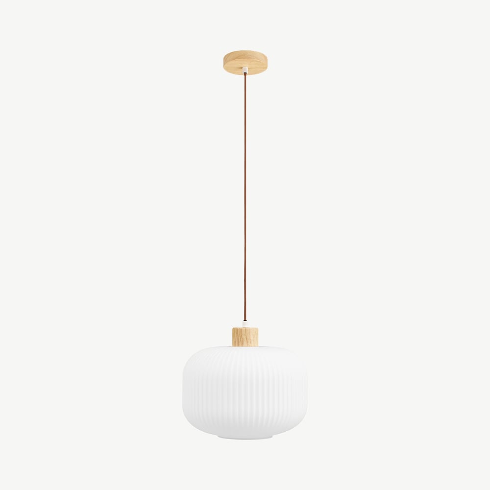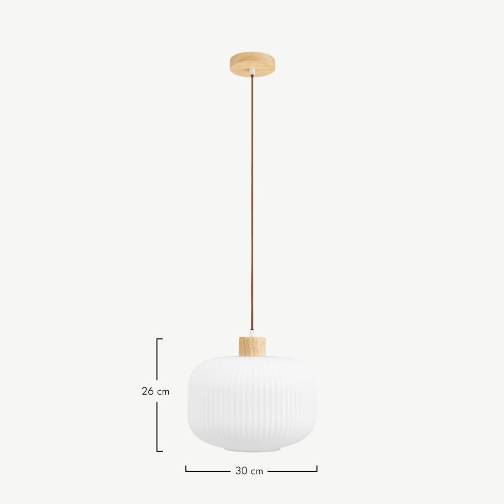 De witte glazen kap en houten details zorgen voor een strak en natuurlijk uiterlijk dat perfect combineert met metaal, hout of neutrale kleuren. Ideaal voor Scandinavische of moderne interieurs.