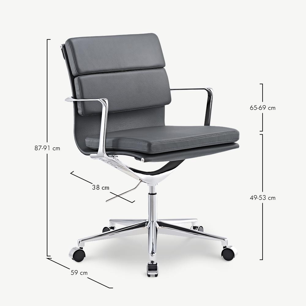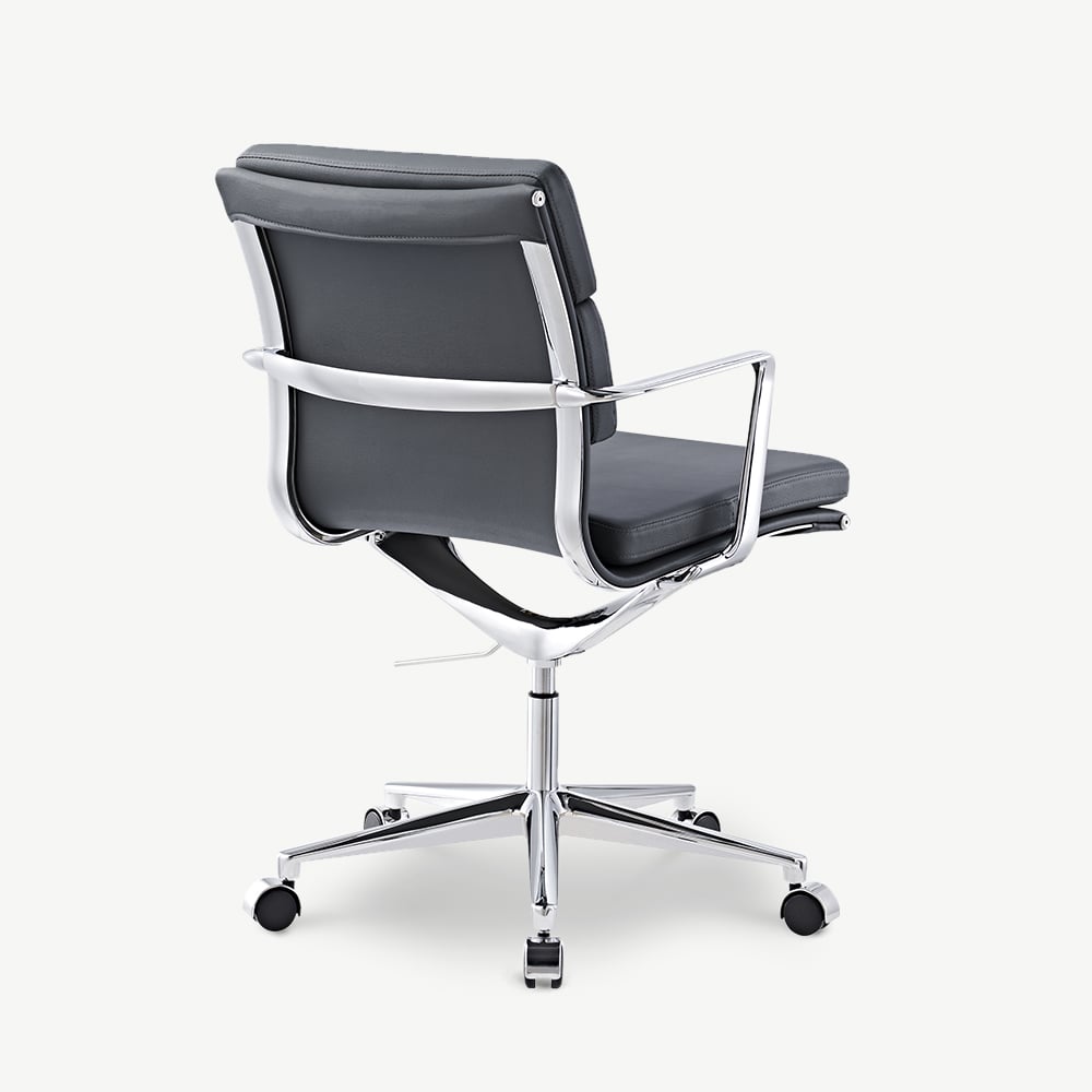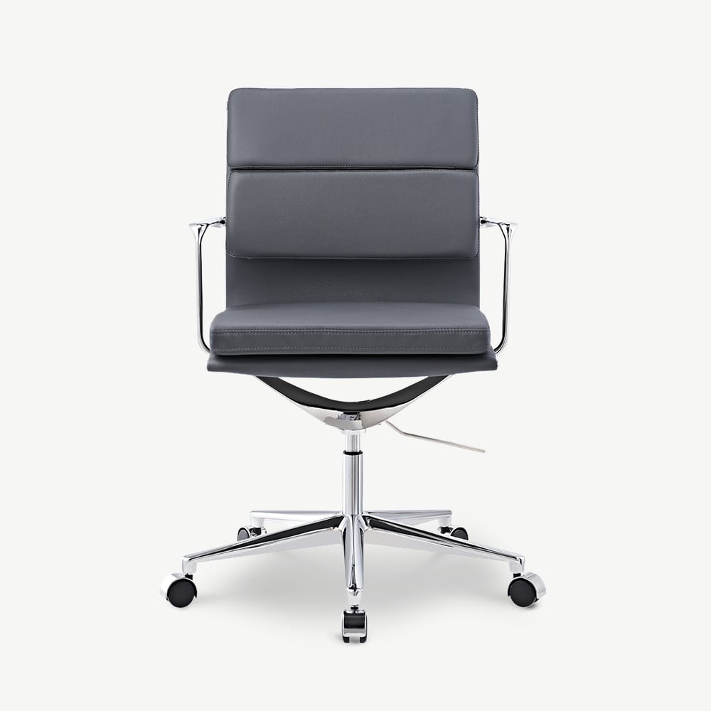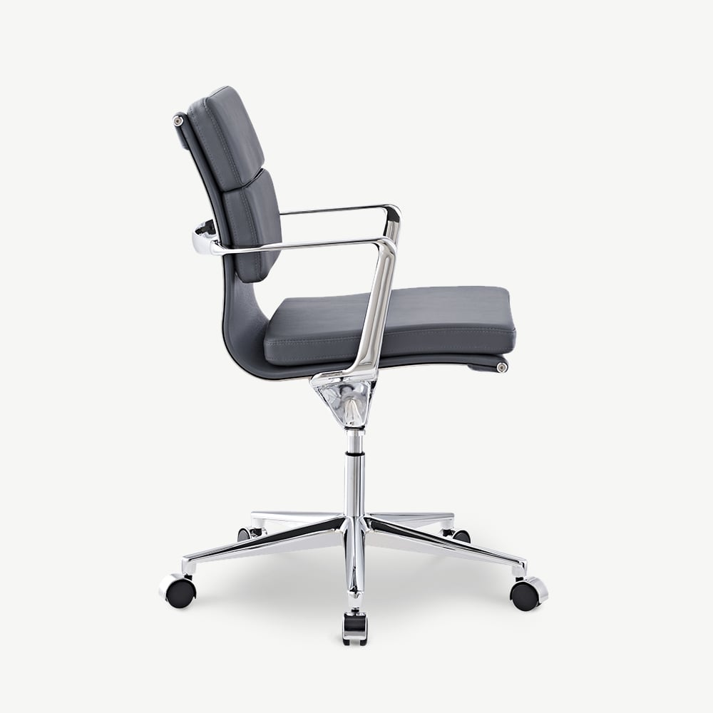 De Bern Softpad Bureaustoel combineert een laag rugleuningontwerp met premium grijsbruine leren bekleding, wat zorgt voor comfort en elegantie. De gewatteerde rugleuning en zitting bieden een ondersteunende oplossing voor de werkplek, ideaal voor moderne kantoren of thuisomgevingen.