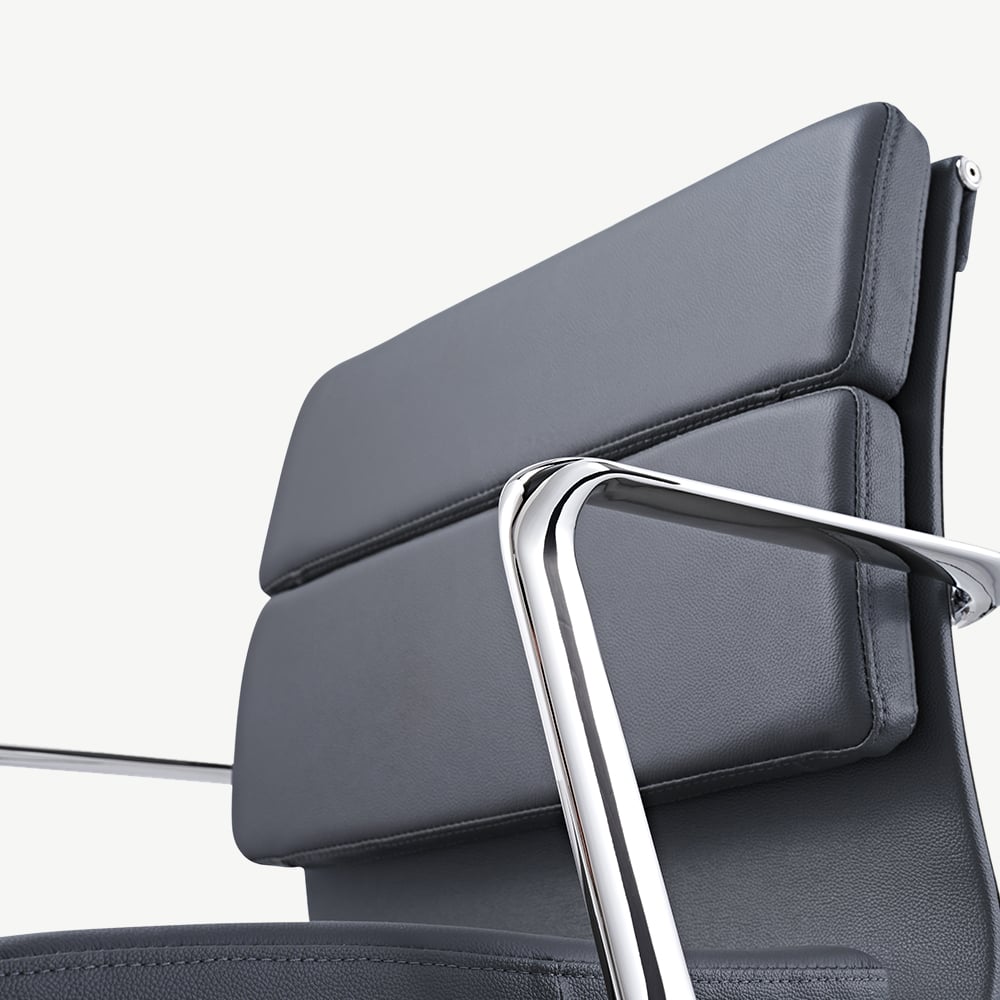 Ondersteund door een duurzaam frame en poten van chroom metaal, combineert de stoel stijl met stevigheid. De mid-century designelementen, gecombineerd met de lage rugleuningstructuur, voegen een tijdloze en elegante touch toe aan elke werkplek.