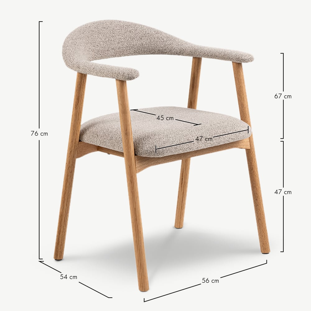 Met een licht gebogen rugleuning en ondersteunende armleuningen biedt de Bjorn eetkamerstoel optimaal comfort voor lange diners en ontspannen momenten. De zachte bouclé zitting voelt heerlijk cosy aan, terwijl het stevige eikenhouten frame zorgt voor langdurige stabiliteit. Lichtgewicht maar toch robuust, ideaal voor eetkamers, thuiskantoren of stijlvolle leeshoeken.