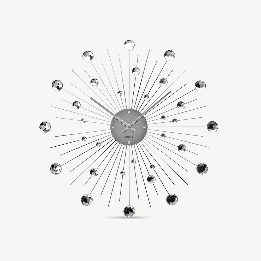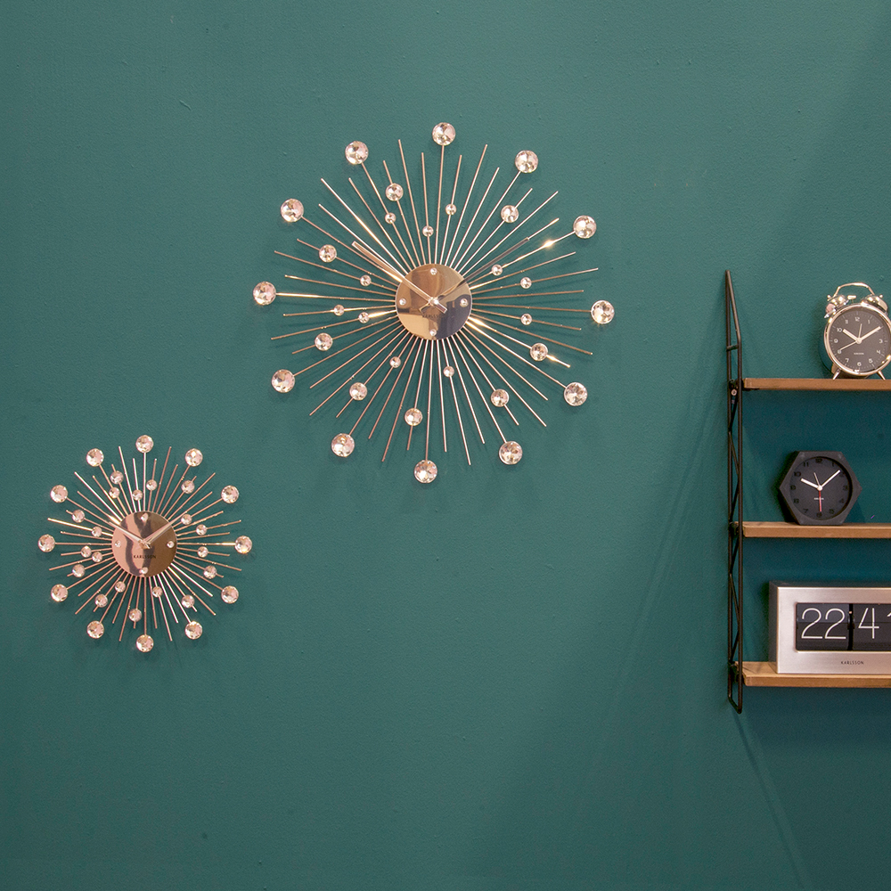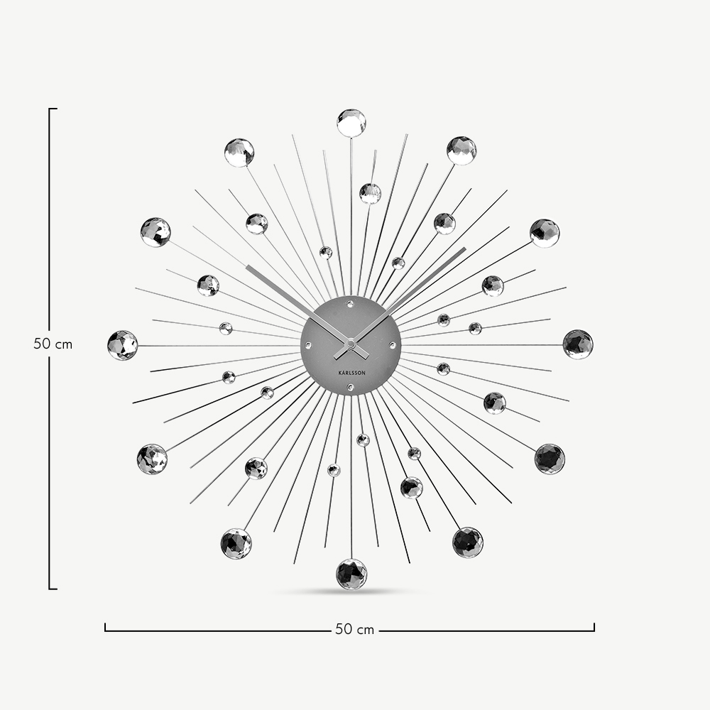 De Burst Wandklok valt op door zijn expressieve, onderscheidende ontwerp, met glanzende kristallen die een luxueus tintje geven aan de moderne uitstraling. Deze klok is verkrijgbaar in twee maten en drie kleuren en biedt veelzijdigheid om bij uw persoonlijke stijl te passen en uw interieur aan te vullen. Met een diameter van 50 cm maakt de grote versie een krachtig statement, perfect om een vleugje glamour aan je woonruimte toe te voegen.Tijdloze wandklok, moderne glamour