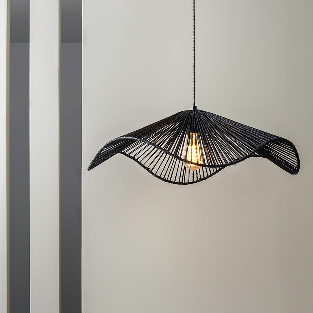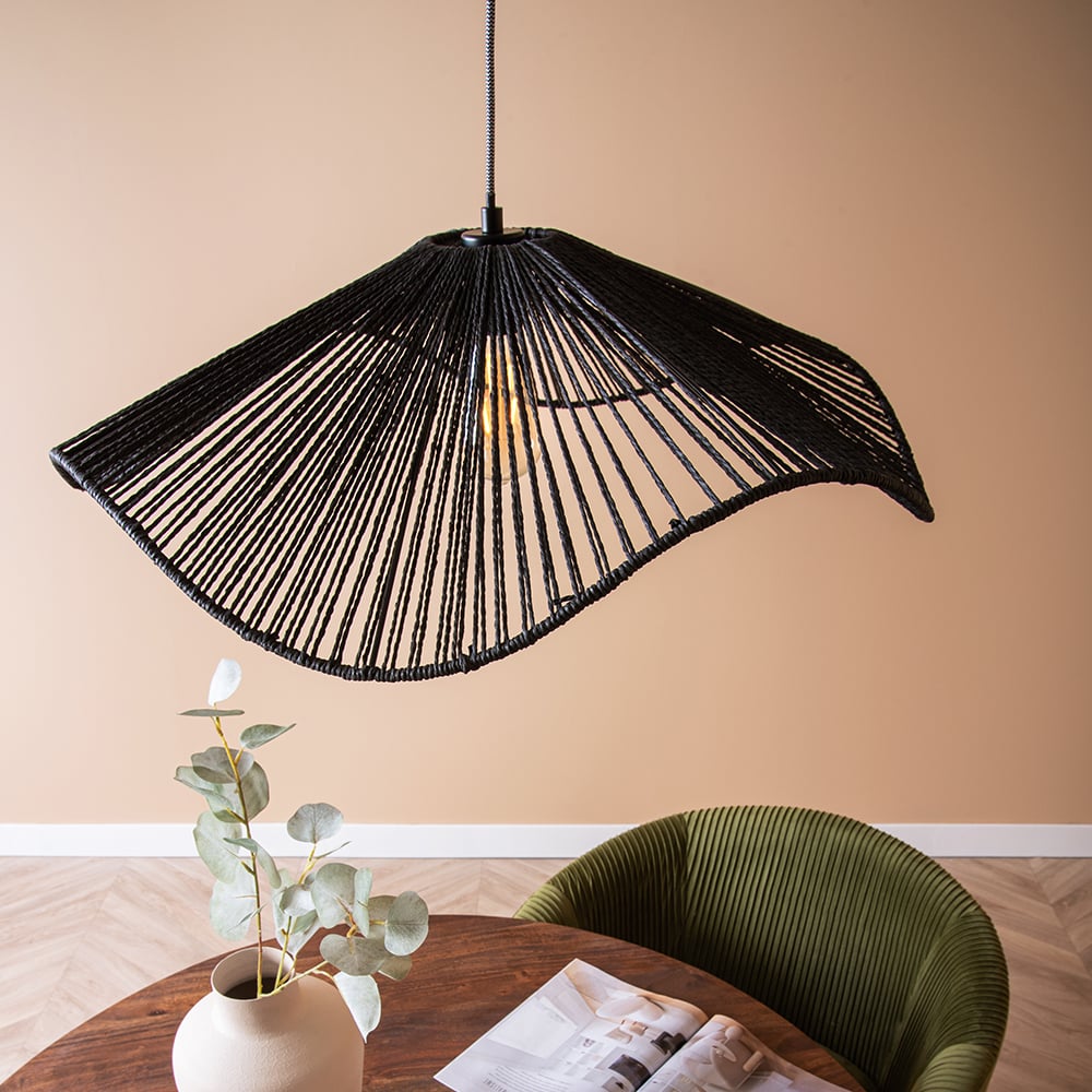 De Fedora hanglamp fascineert door zijn zachte, golvende effect en natuurlijke ronde vormen, en belichaamt een minimalistische maar stijlvolle toets die elke eethoek naar een hoger niveau tilt. De elegante zwarte afwerking vormt een aanvulling op een reeks interieurstijlen, van eigentijds tot klassiek, en biedt naast een esthetische aantrekkingskracht ook veelzijdigheid. Deze lamp is niet alleen een lichtbron; het is een statement-stuk dat de sfeer van uw maaltijden en bijeenkomsten verbetert.Veelzijdige opties, design hanglamp
