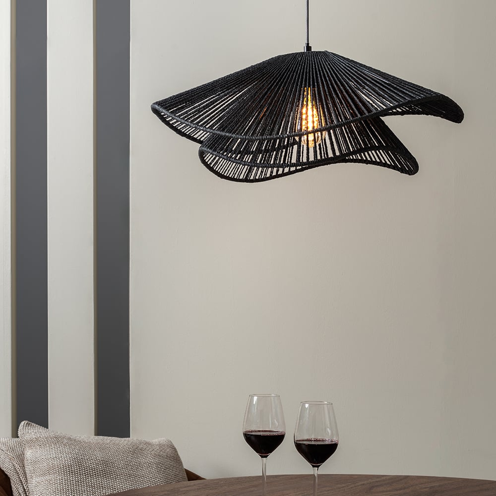 Onthulling van de Fedora hanglamp in zwart, gelaagd – een opvallend elegante verlichtingsoplossing, ontworpen om de sfeer van uw eethoek te verbeteren.