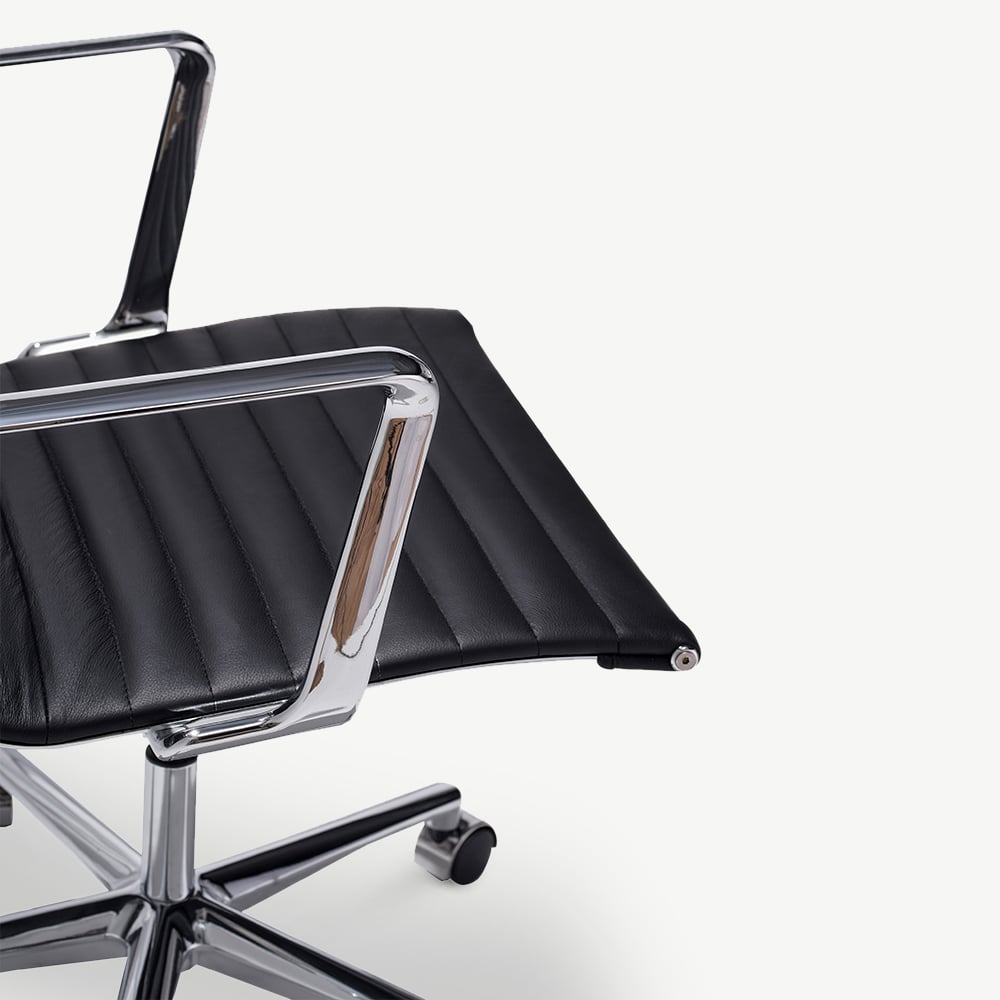 Met een stevig frame van chromen metaal combineert deze stoel stijl met stevigheid. De mid-century ontwerpelementen, in combinatie met de lage rugleuning, geven elke werkplek een tijdloze en elegante uitstraling.