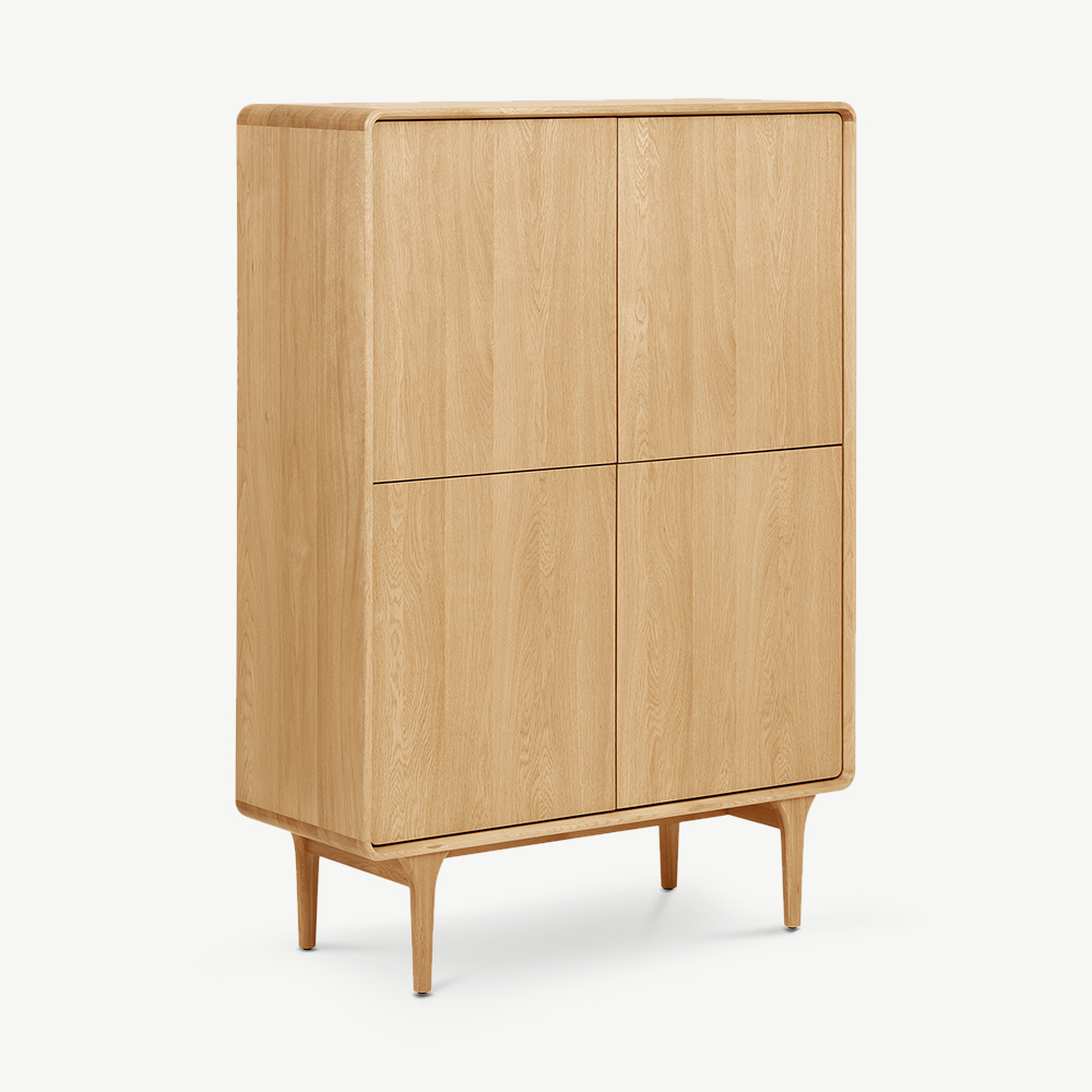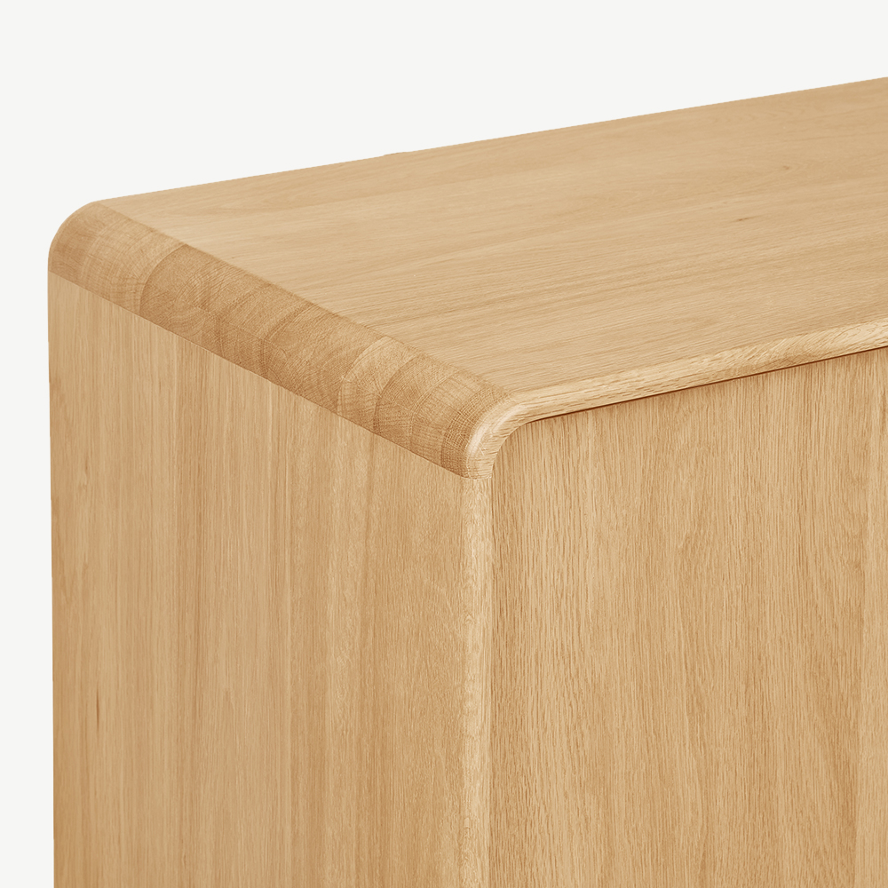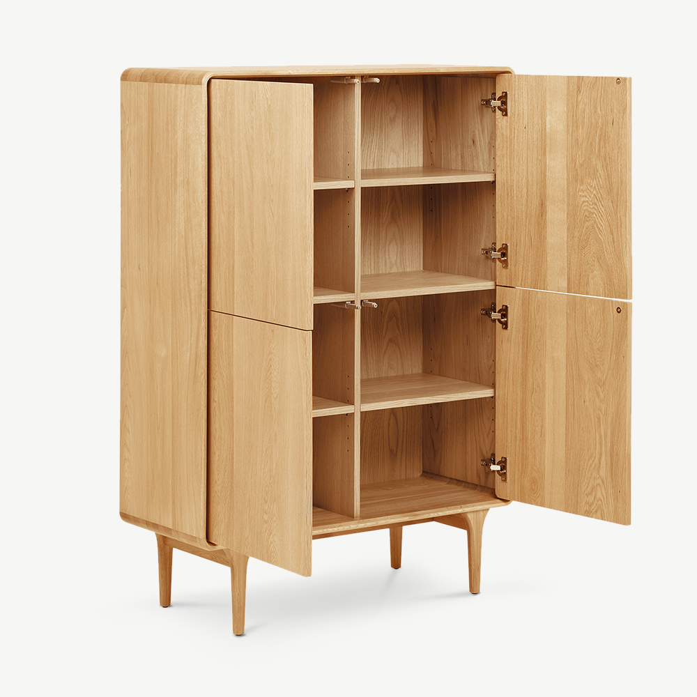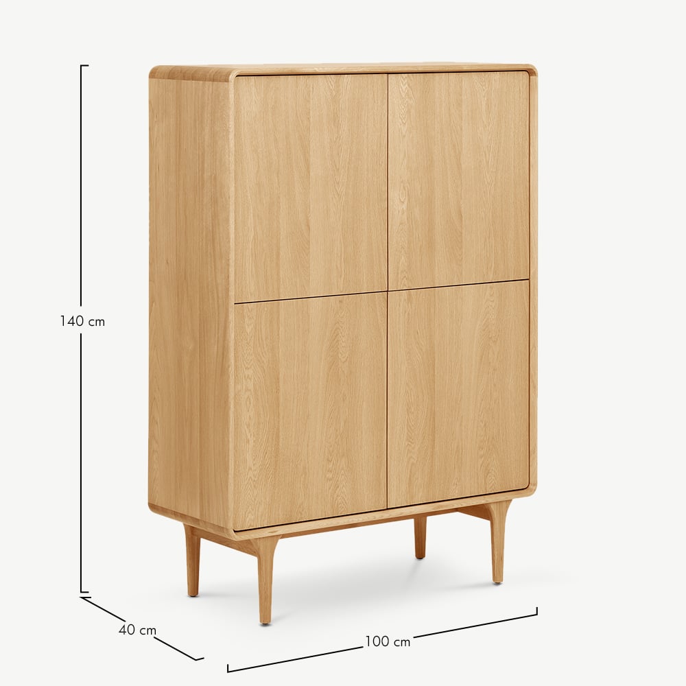 Gemaakt van eikenhout met een gladde, natuurlijke afwerking, viert deze kast minimalistisch design en authentieke materialen. De veelzijdige kleur combineert prachtig met zachte stoffen, keramiek en neutrale tinten, wat zorgt voor een rustig en stijlvol interieur.