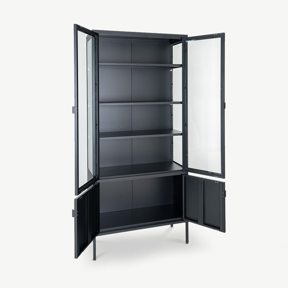 De Darwin 4-Deurs Vitrinekast combineert industrieel design met functionele elegantie en is de ideale opbergoplossing voor moderne woningen. Met twee glazen deuren en drie planken voor display en twee gesloten deuren voor verborgen opbergruimte biedt het een stevige metalen constructie die stijl en functionaliteit toevoegt aan elke ruimte.
