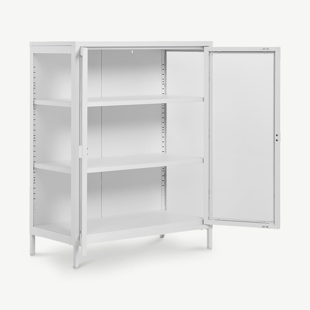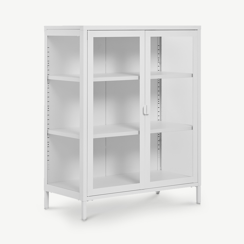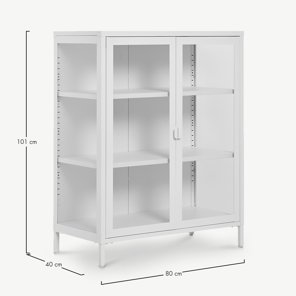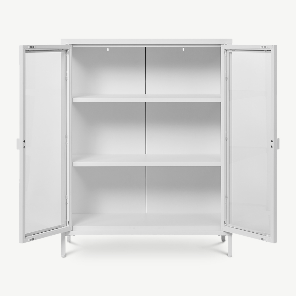 De kast is gemaakt van een stevig wit metalen frame en glazen deuren en zorgt voor een frisse, moderne uitstraling in je interieur. Het minimalistische design past perfect bij Scandinavische, kust- en moderne stijlen. Combineer hem met licht houten meubels, zachte stoffen of pastelkleuren voor een frisse en uitnodigende sfeer.