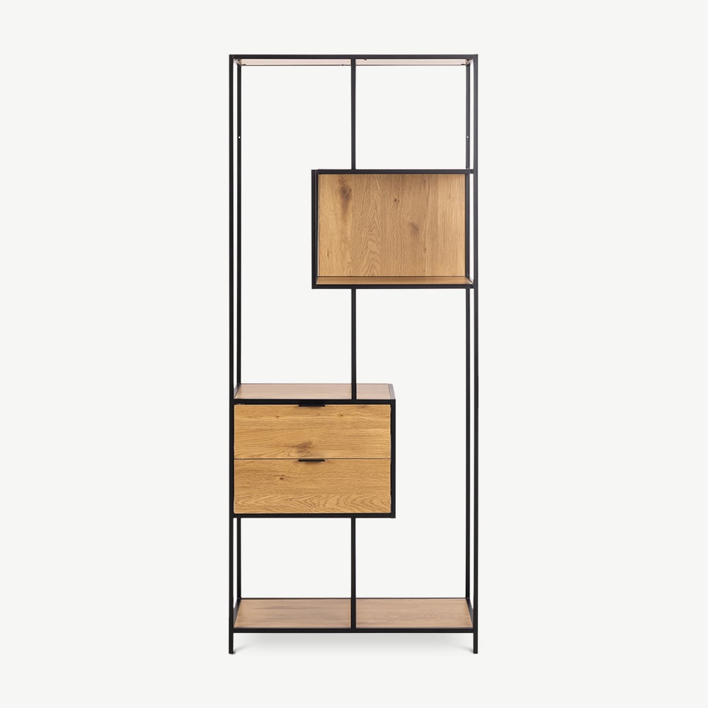 De Dover boekenkast combineert strakke industriële lijnen met warme houttinten tot een stijlvolle én praktische opbergoplossing. Met een asymmetrische indeling, vier open planken en twee ruime lades biedt dit meubel genoeg ruimte voor boeken en accessoires. Gemaakt van FSC™-gecertificeerde materialen en voorzien van een omkeerbare achterwand voor extra flexibiliteit.