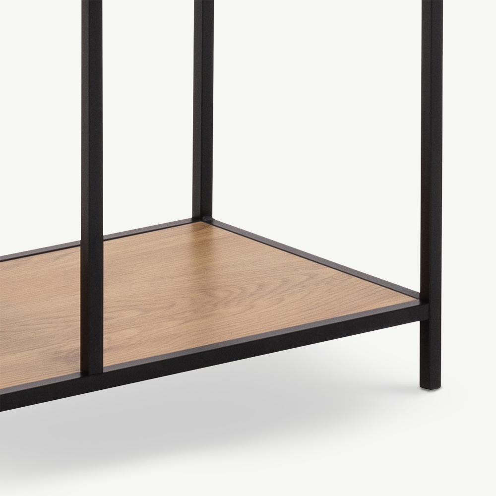 De planken en lades zijn afgewerkt in een wildeikenlook die de warmte van hout geeft, maar makkelijk te onderhouden is. Het zwarte gepoedercoate metalen frame zorgt voor een modern contrast en is stevig genoeg voor dagelijks gebruik. Perfect te combineren met Scandinavische, industriële of rustieke interieurs en mooi bij neutrale tinten, leren meubels of zwarte accenten.