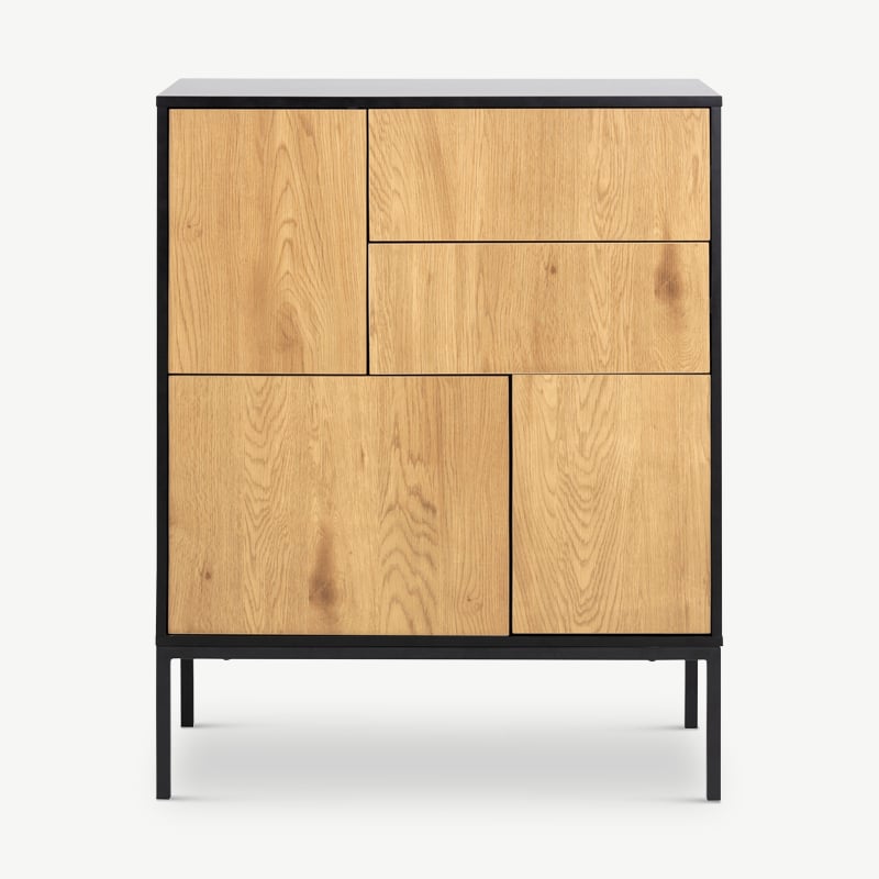 Het hoge Dover dressoir heeft een opvallende deurafwerking in wildeiken, gecombineerd met een zwarte houten structuur, wat een unieke mix van natuurlijke warmte en industriële stijl biedt. Het slanke, compacte ontwerp maakt het tot een ideale opbergoplossing voor kleinere ruimtes.